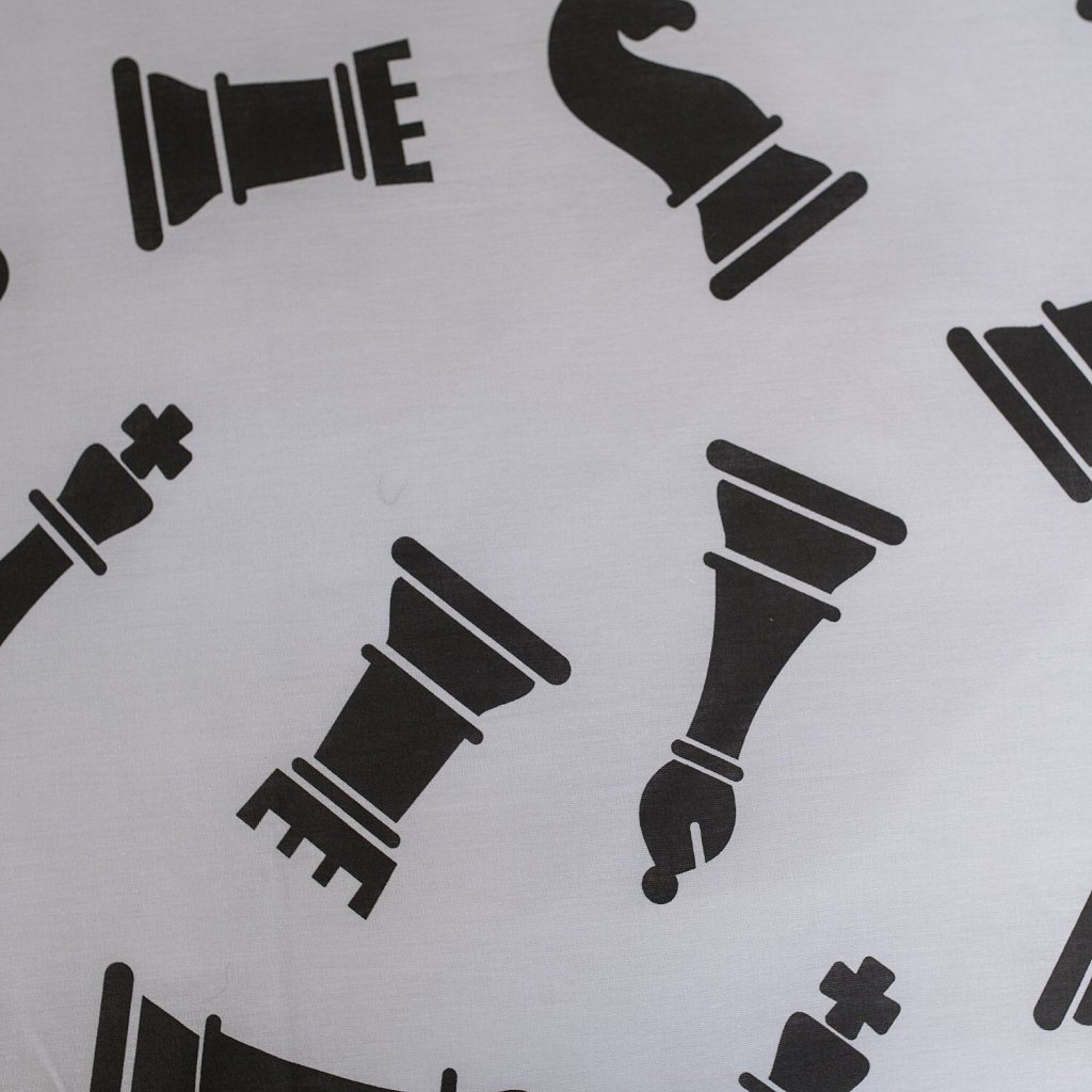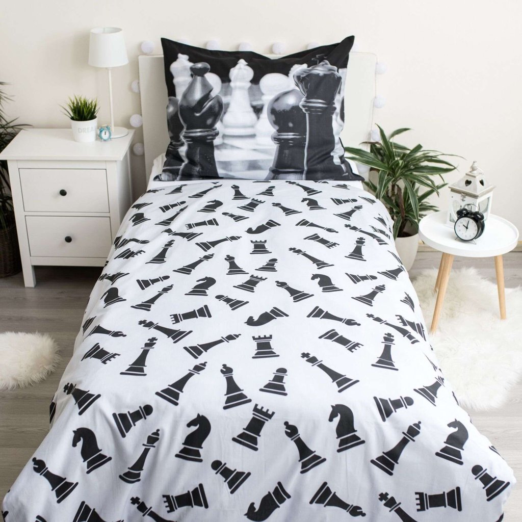 Vneste do své ložnice sofistikovaný styl s povlečením inspirovaným světem šachů. Povlak na přikrývku i polštář zdobí detailní vyobrazení černých a bílých šachových figur, které vytvářejí moderní a elegantní vzhled. Přikrývka zaujme výrazným černobílým vzorem s velkými figurami, zatímco polštář je dekorován menšími figurkami po celém obvodu.