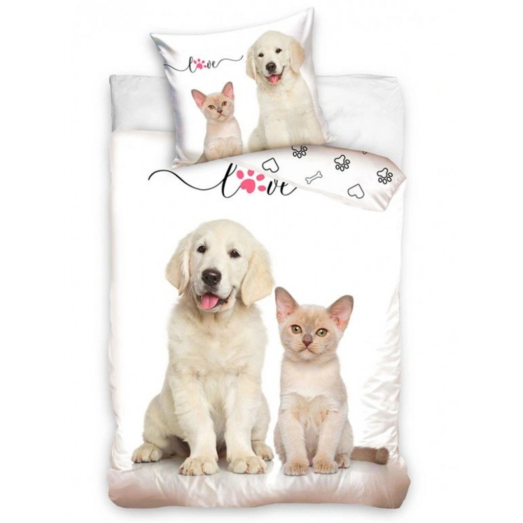 Zamilujte se na první pohled do roztomilého povlečení, které spojuje něhu a přátelství – bílý labradorský retrívr a béžové koťátko sedící bok po boku pod nápisem „love“, kde písmeno „o“ tvoří růžová tlapka, rozzáří každou ložnici. Polštář navíc zdobí drobné vzory tlapek, kostí a srdíček, které dodávají celému setu hravý a něžný vzhled.