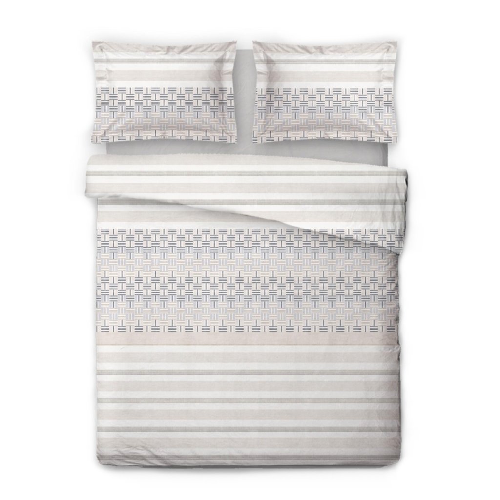 Povlečení Mikroflanel Elegance značky SLEEP WELL® spojuje moderní design s maximálním pohodlím. Jemné pruhy v bílé a šedé barvě doplněné geometrickým vzorem v modré a béžové dodávají ložnici sofistikovaný vzhled.