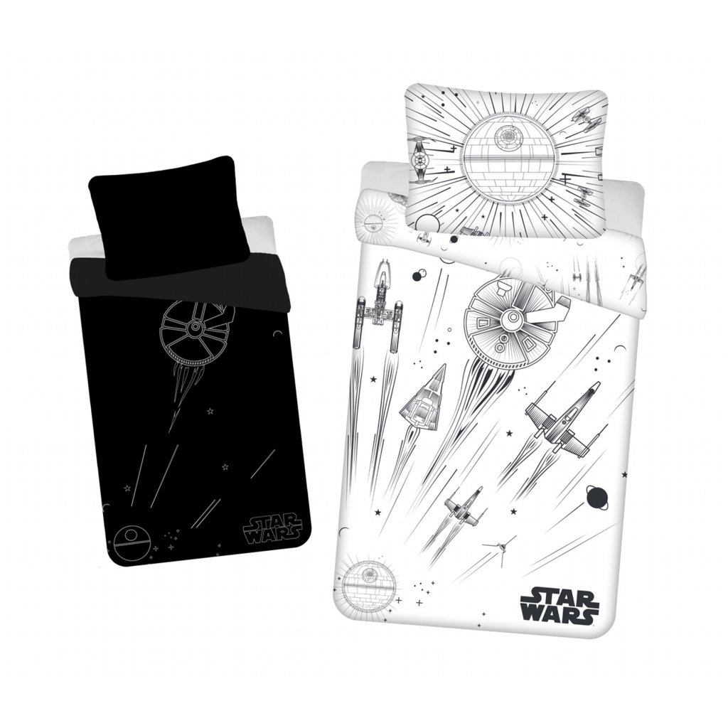 Toto povlečení je perfektní volbou pro každého fanouška Star Wars, který chce usínat pod ochranou temné strany Síly – nebo jen s pořádnou dávkou vesmírného stylu. Přikrývku zdobí galaktický motiv Hvězdy smrti a vesmírných lodí na kontrastním černobílém podkladu. Stylový polštář ladí s přikrývkou a dotváří celkový vzhled.