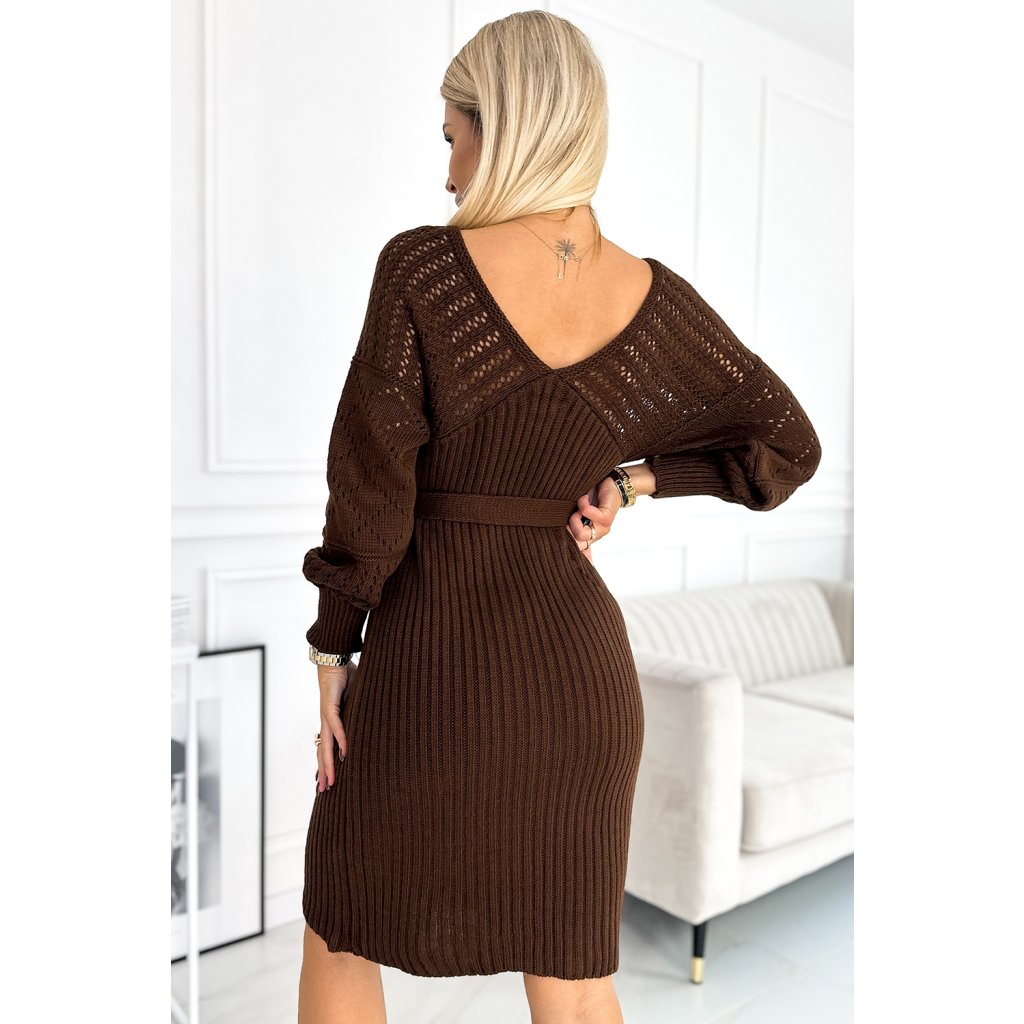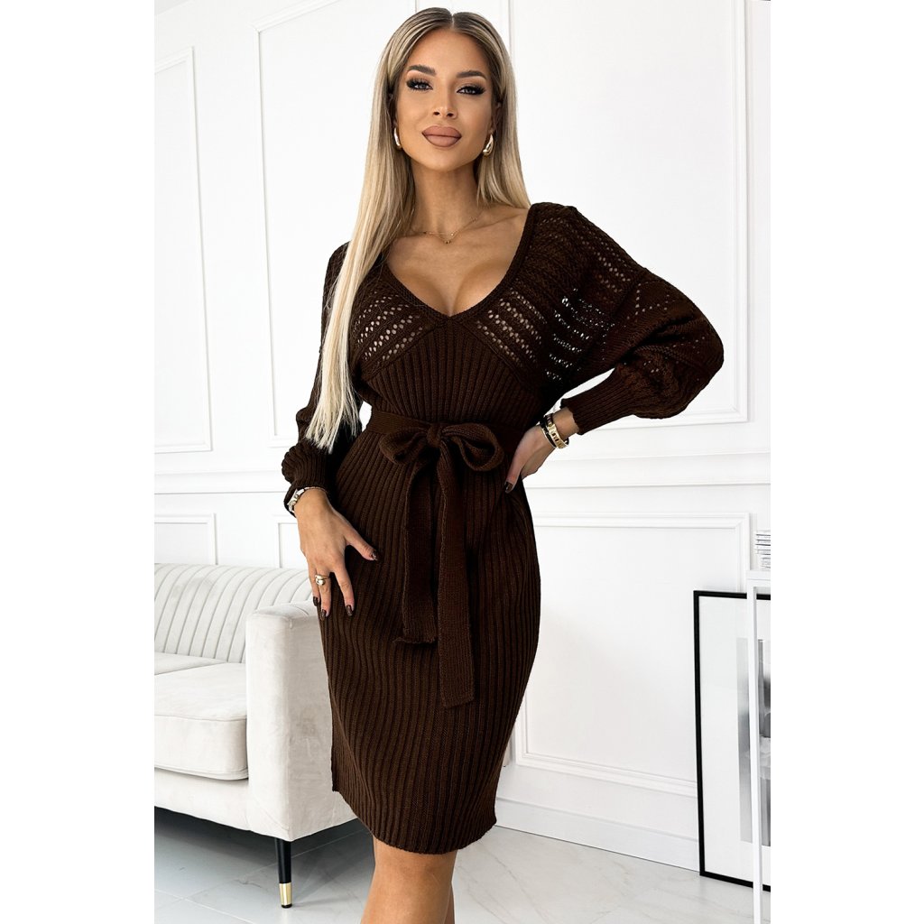 Prolamované svetrové šaty s výstřihem a zavazováním - čokoládová barva 507-3