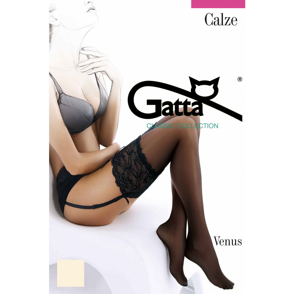 Dámské punčochy Gatta Venus s obsahem lycry a opletené polyamidovým hedvábím (satin sheer). V horní části je našitá krajka.Doplňkové parametry
