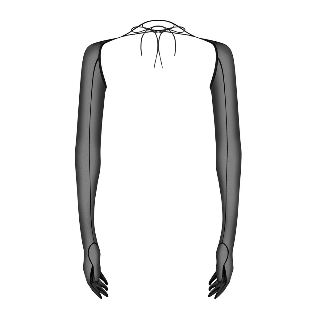Sexy, dlouhé dámské rukavice. Tyto rukavice po ramena jsou vyrobeny z pružné, průhledné síťoviny a zavazují se u krku.Složení: 96 % polyamid, 4 % elastan.