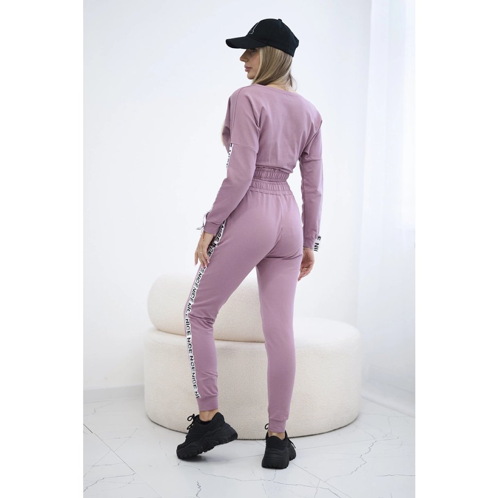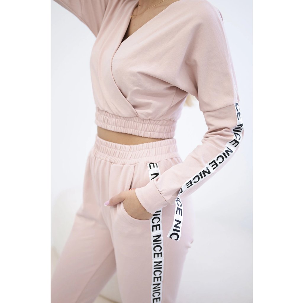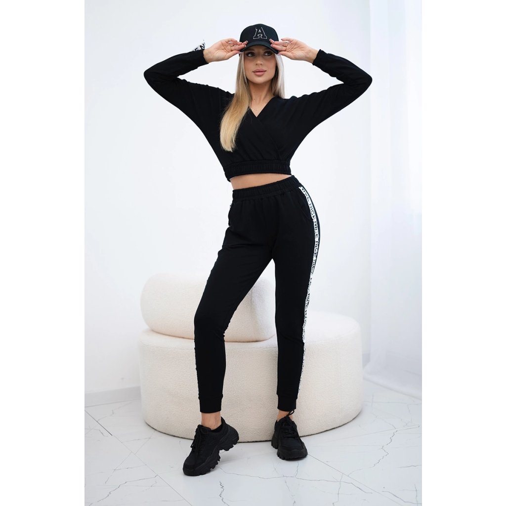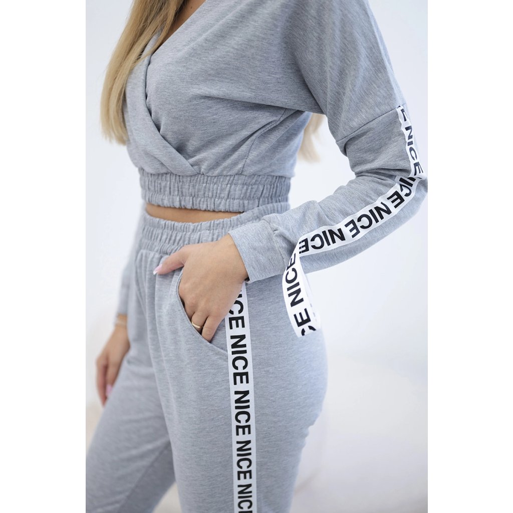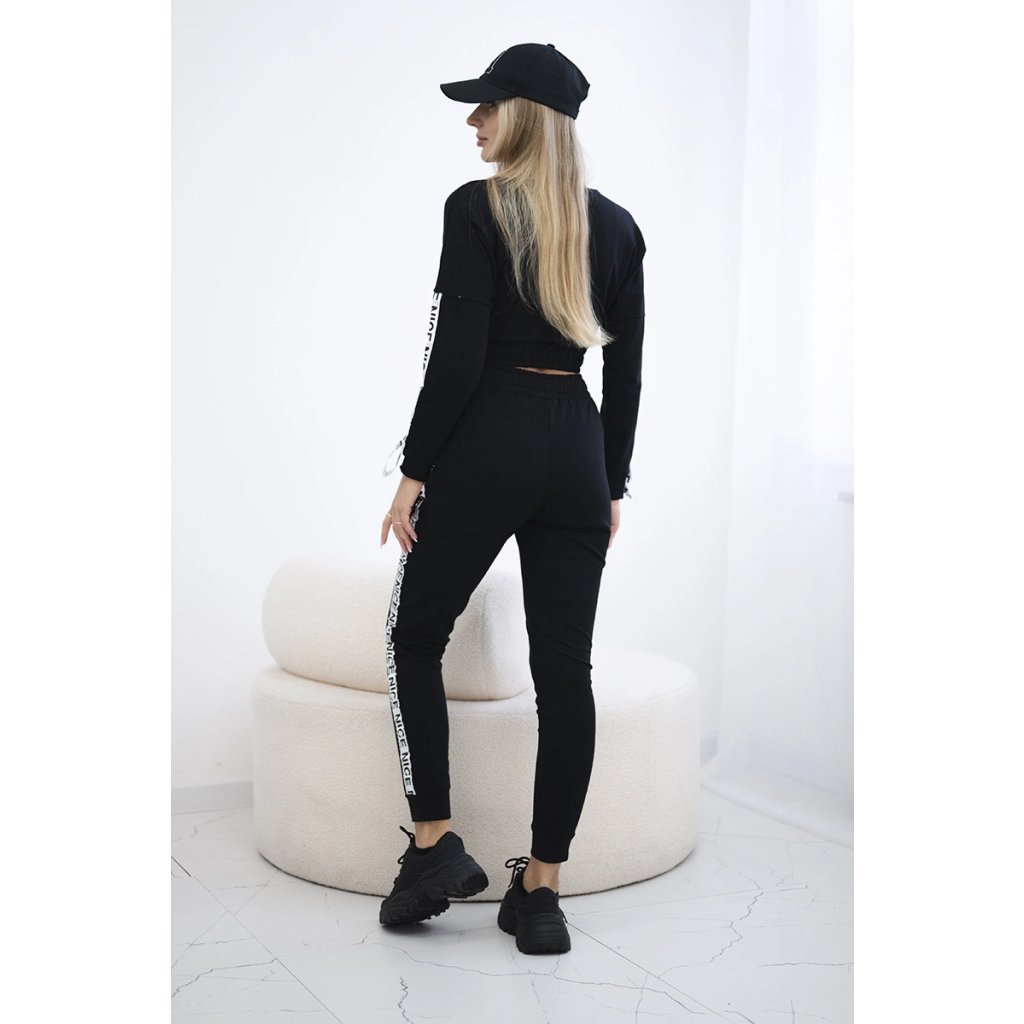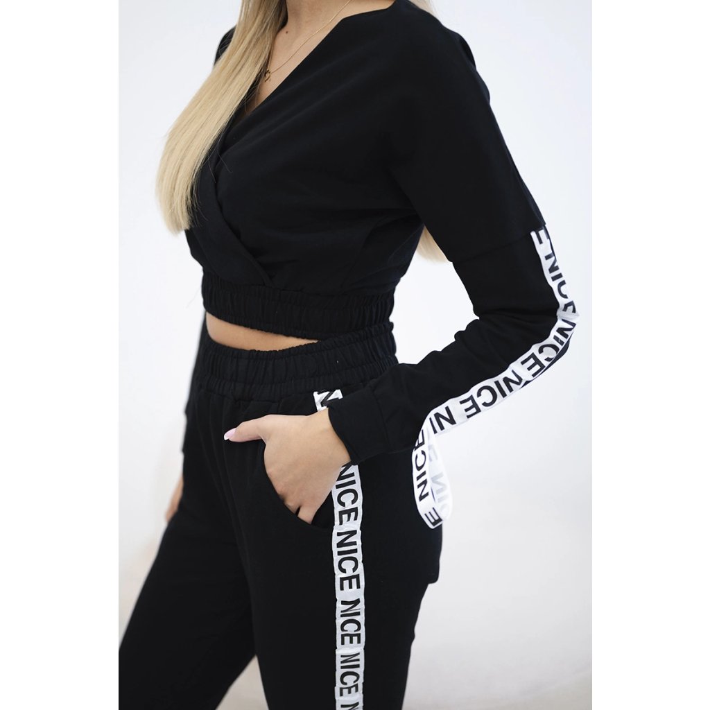 Představujeme vám sadu mikiny a kalhot. Mikina a kalhoty mají ozdobnou stuhu s nápisem. Ve spodní části mikiny je všitá guma. Kalhoty s kapsami. Velmi módní a stylová sada. Sada je vyrobena z vysoce kvalitního materiálu. Velikost je univerzální a vyhovuje dámám velikosti S, M nebo L.