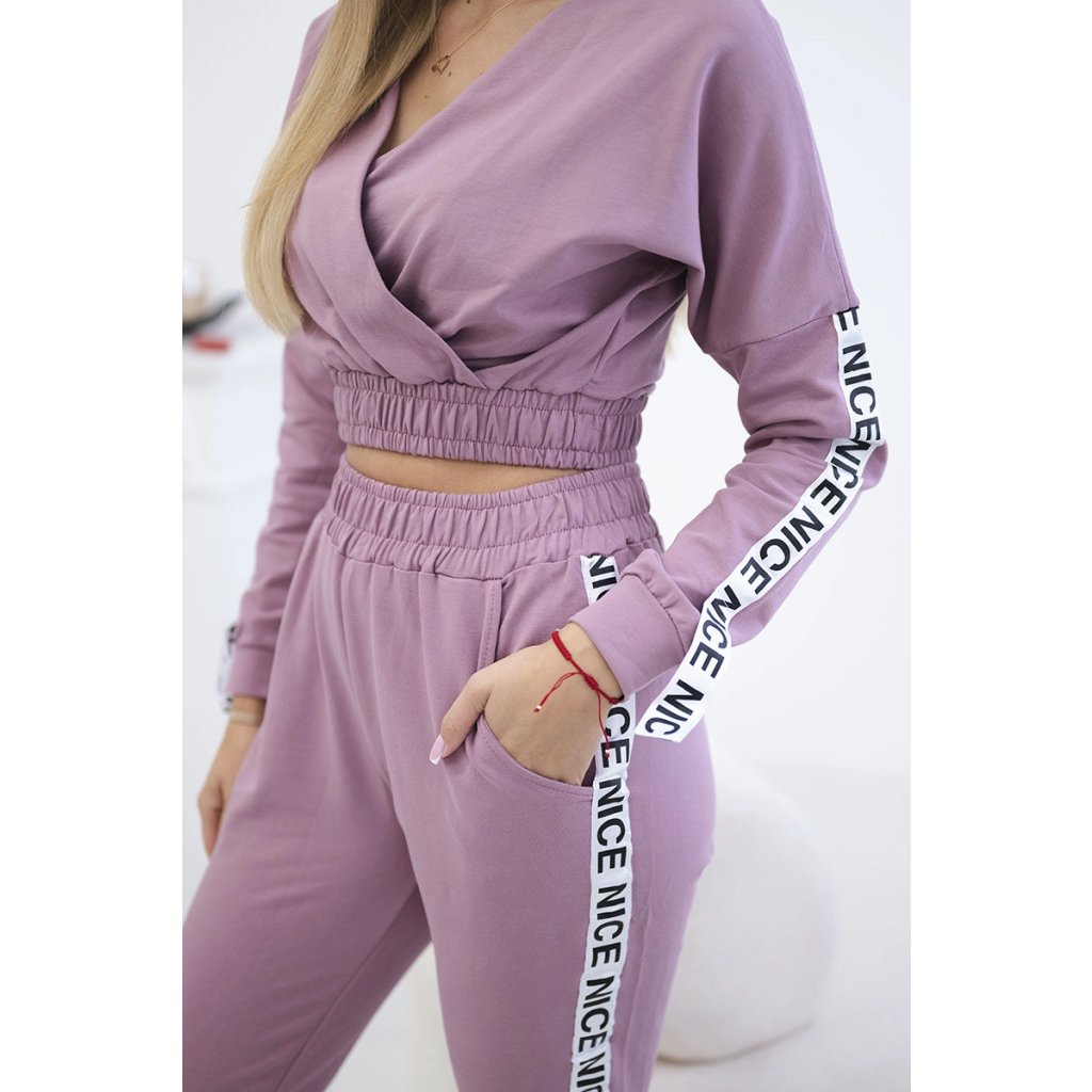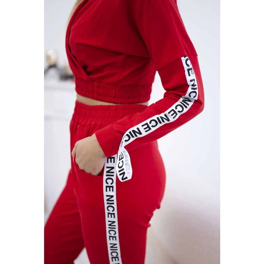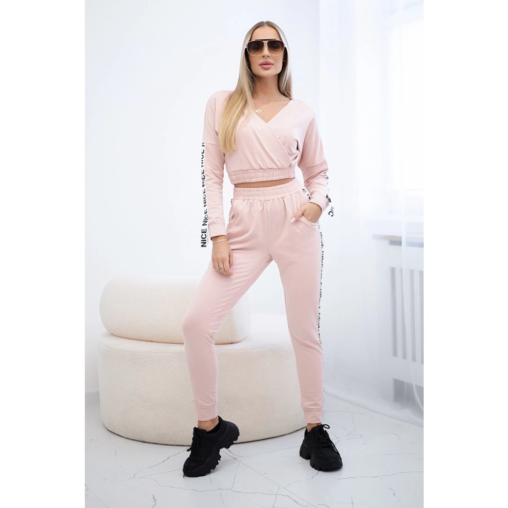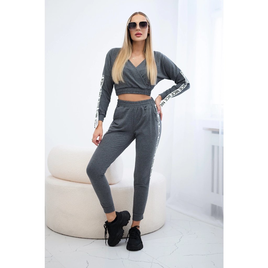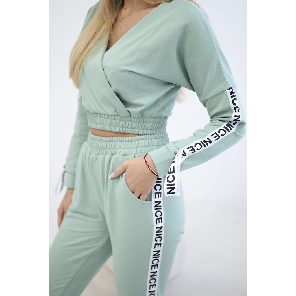 Představujeme vám sadu mikiny a kalhot. Mikina a kalhoty mají ozdobnou stuhu s nápisem. Ve spodní části mikiny je všitá guma. Kalhoty s kapsami. Velmi módní a stylová sada. Sada je vyrobena z vysoce kvalitního materiálu. Velikost je univerzální a vyhovuje dámám velikosti S, M nebo L.