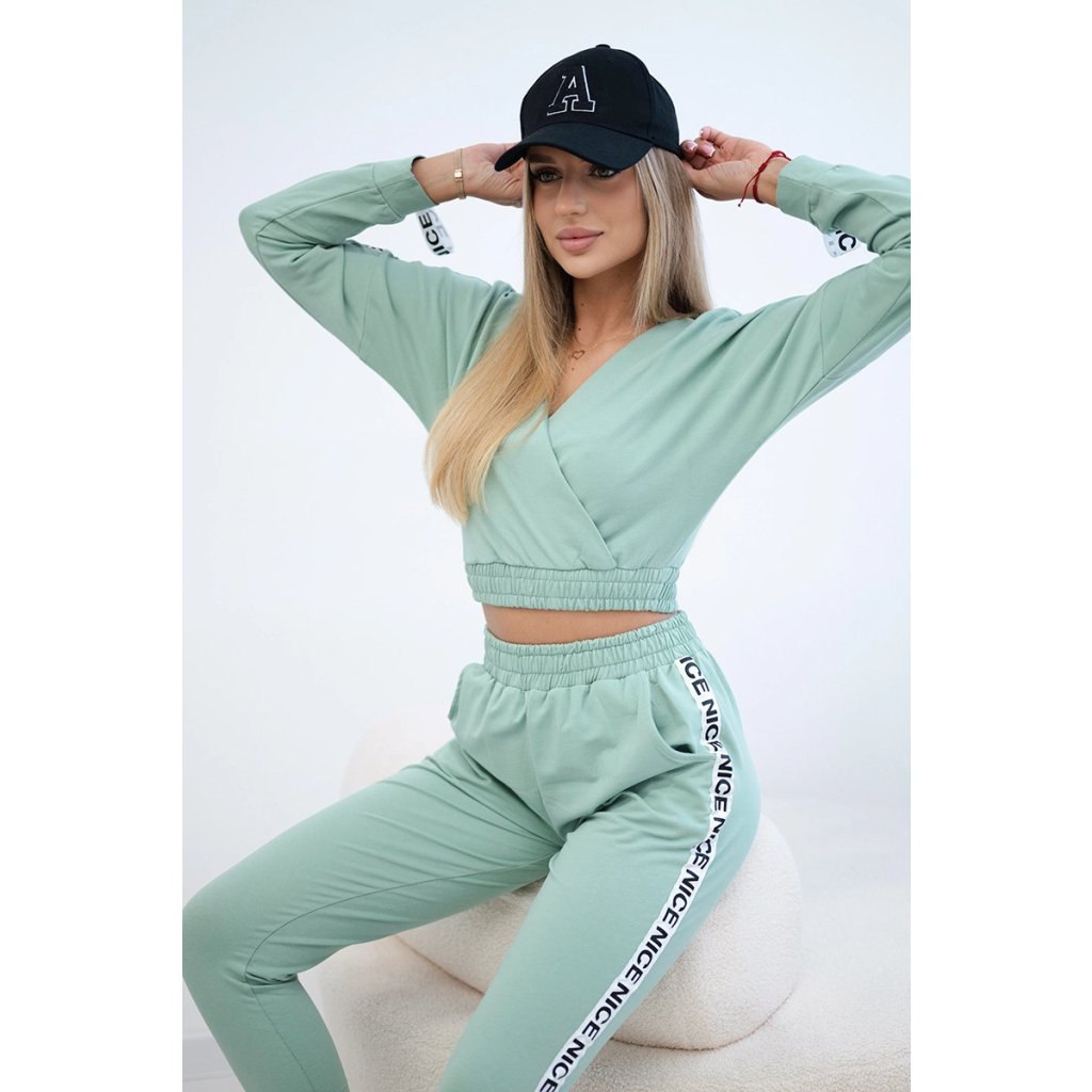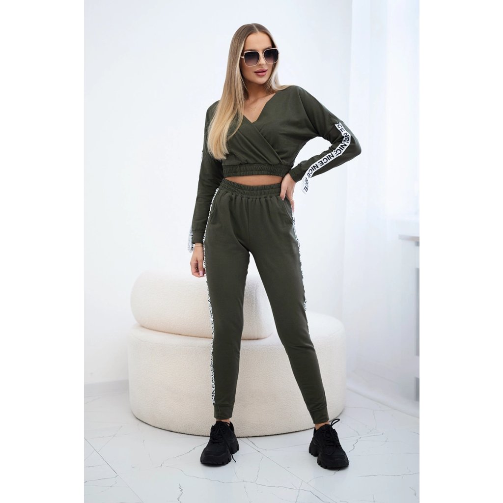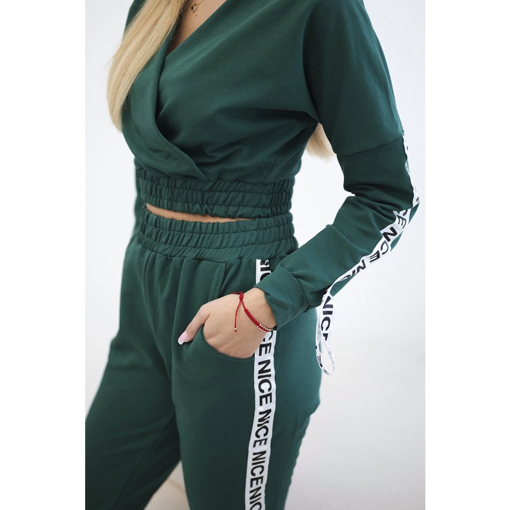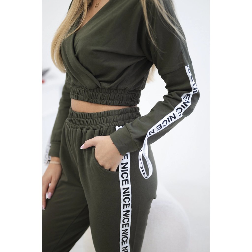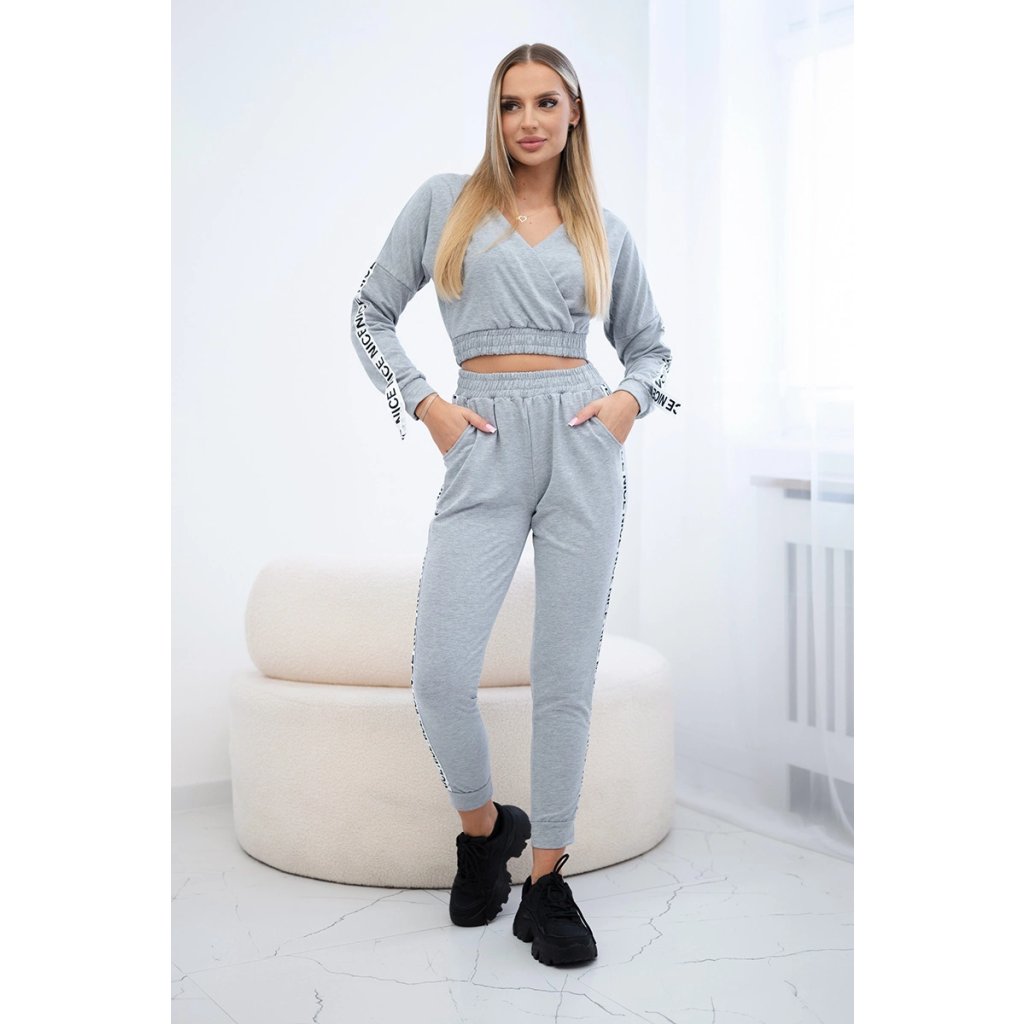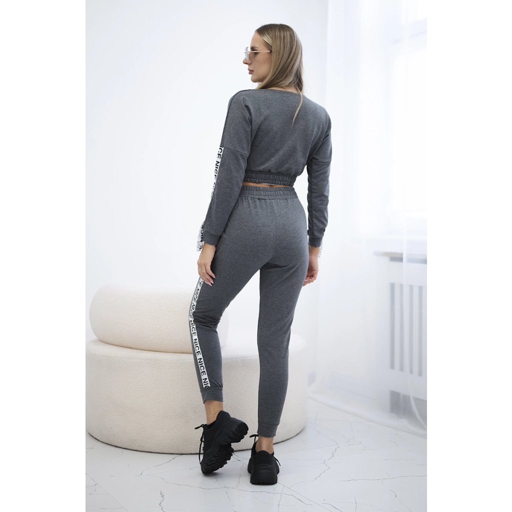 Představujeme vám sadu mikiny a kalhot. Mikina a kalhoty mají ozdobnou stuhu s nápisem. Ve spodní části mikiny je všitá guma. Kalhoty s kapsami. Velmi módní a stylová sada. Sada je vyrobena z vysoce kvalitního materiálu. Velikost je univerzální a vyhovuje dámám velikosti S, M nebo L.