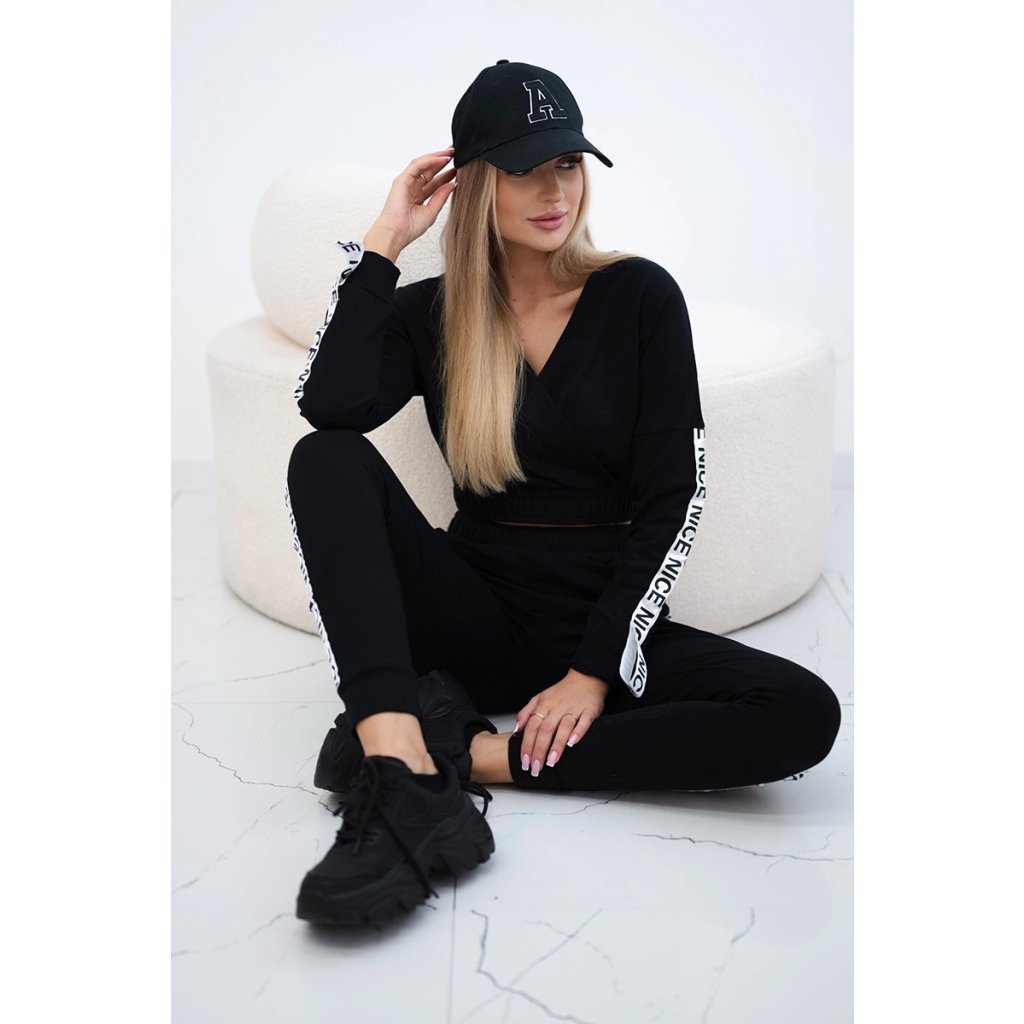 Představujeme vám sadu mikiny a kalhot. Mikina a kalhoty mají ozdobnou stuhu s nápisem. Ve spodní části mikiny je všitá guma. Kalhoty s kapsami. Velmi módní a stylová sada. Sada je vyrobena z vysoce kvalitního materiálu. Velikost je univerzální a vyhovuje dámám velikosti S, M nebo L.
