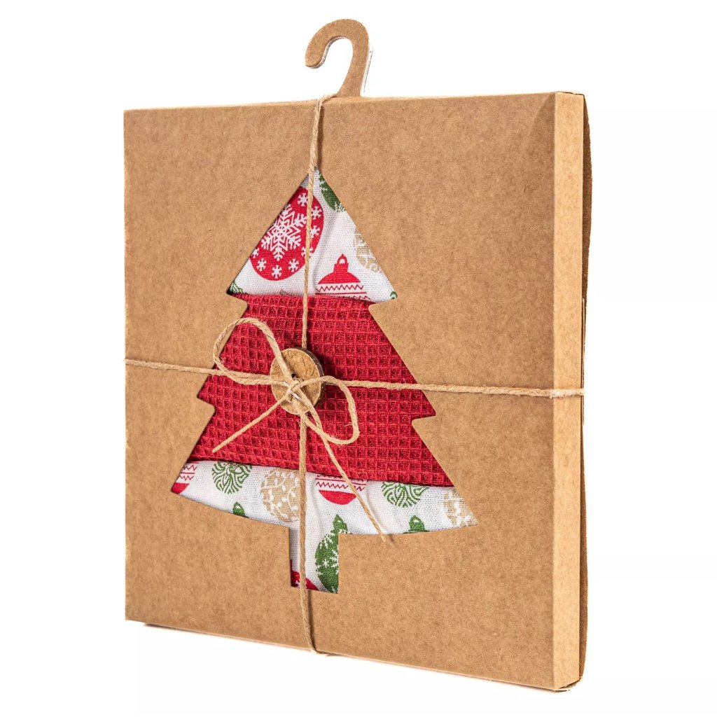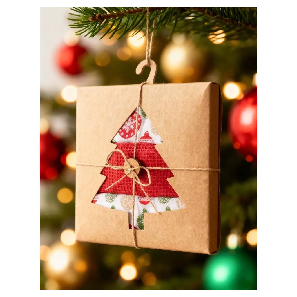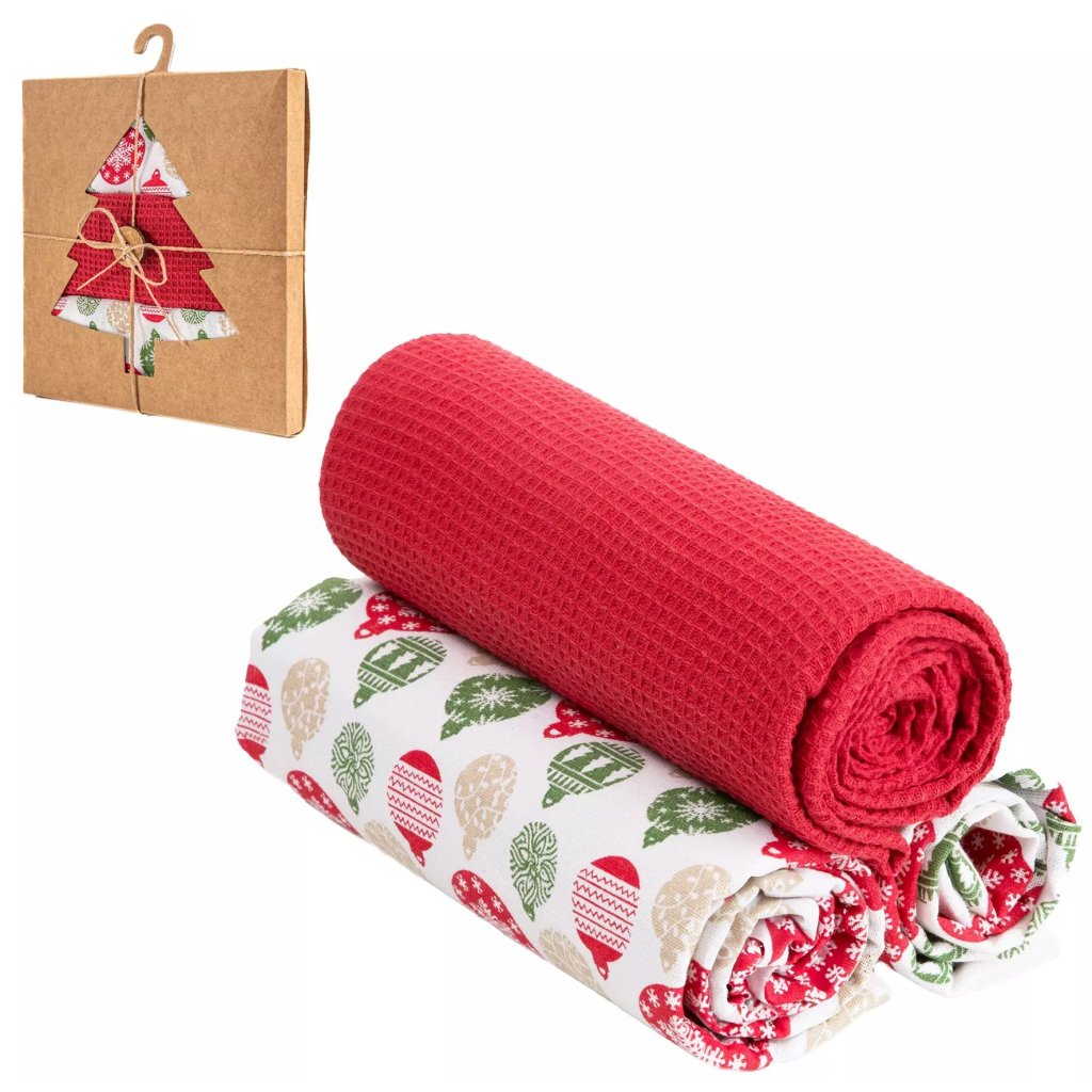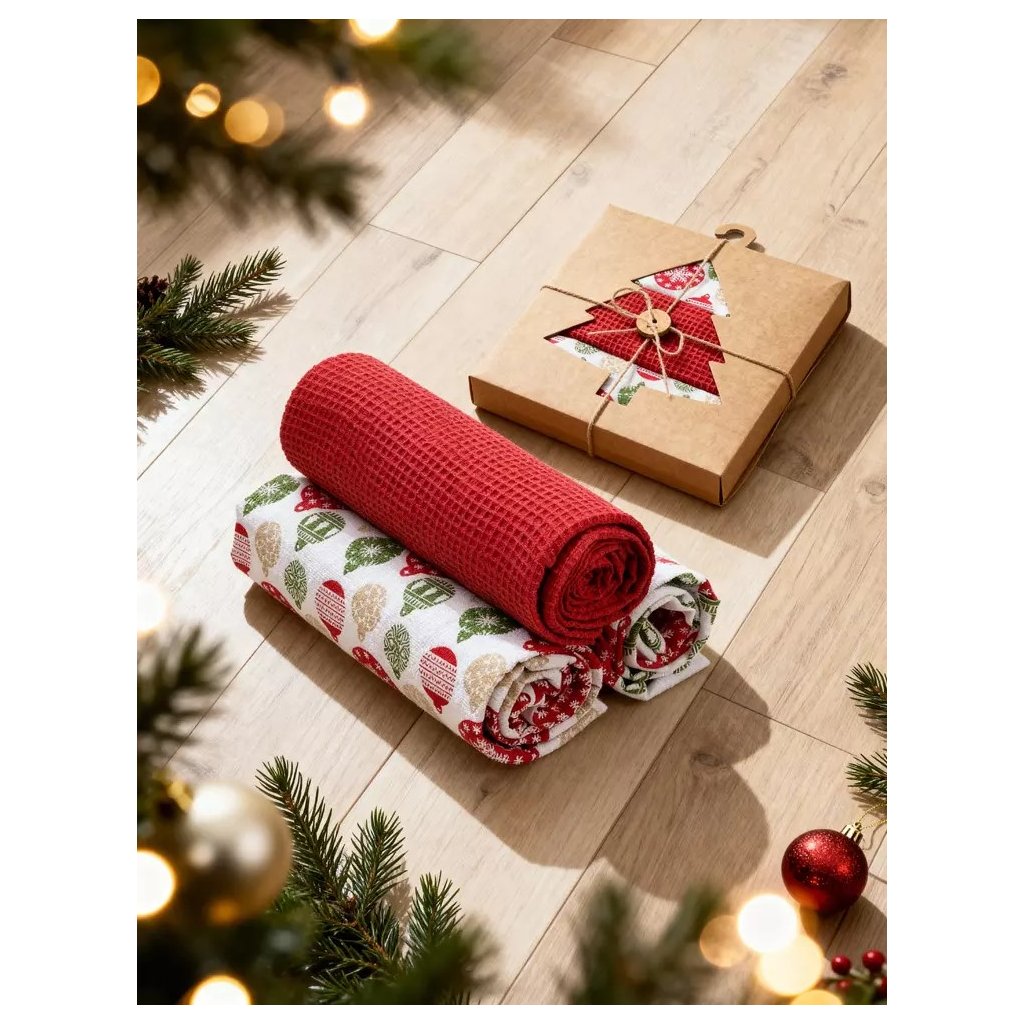 Praktická sada kuchyňských utěrek s vánočním motivem. Sada obsahuje tři utěrky: dvě zdobené vánočními baňkami a jednu v klasické, sytě červené barvě s vaflovou strukturou. Sada je zabalena v papírovém obalu – připravena k darování blízkým.