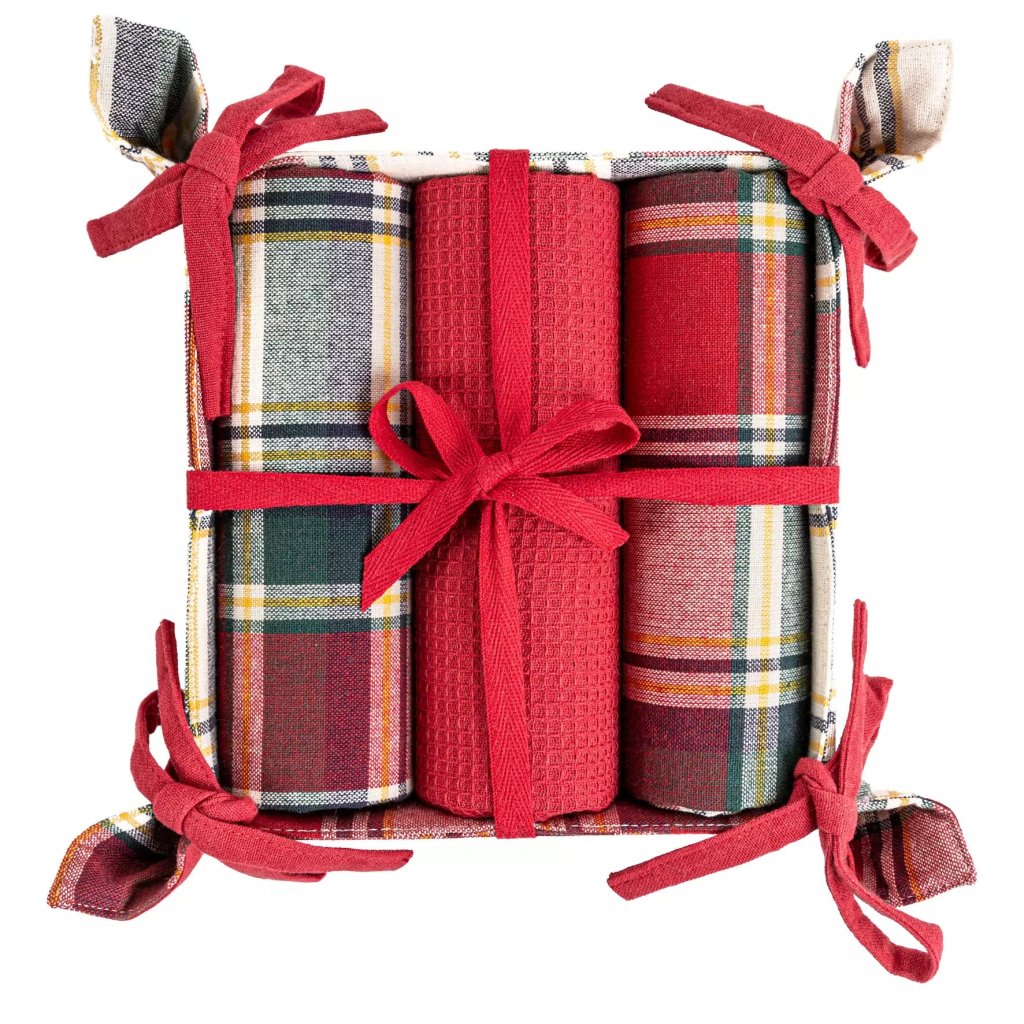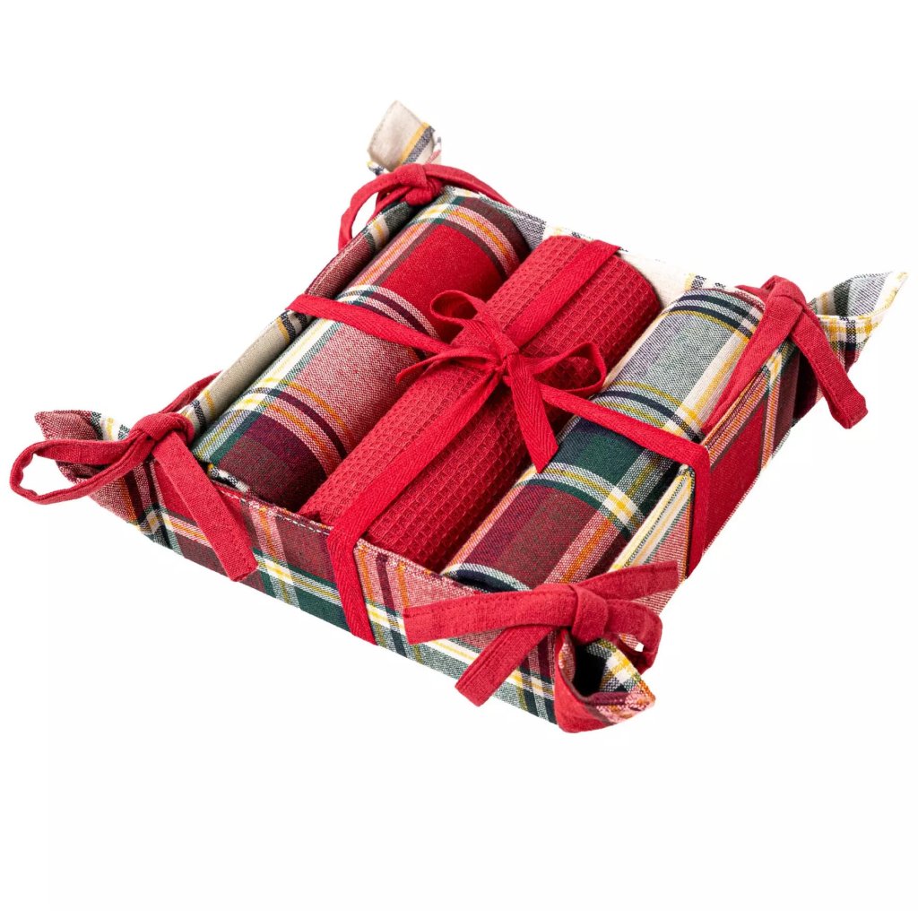 Sada kuchyňských utěrek v klasickém vánočním stylu. Sada obsahuje 3 utěrky o rozměrech 40x70 cm vyrobené ze 100% vysoce kvalitní bavlny. Sada obsahuje dva modely s barevnou kostkou a jeden hladký v červené barvě s vaflovou strukturou, které dokonale absorbují vodu a rychle schnou. Celé je to zabaleno do elegantního látkového košíku, převázaného ozdobnou mašlí.