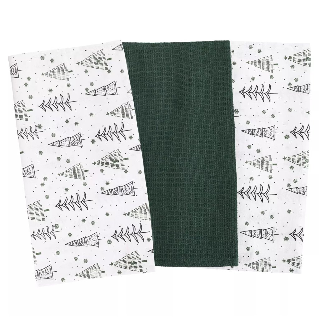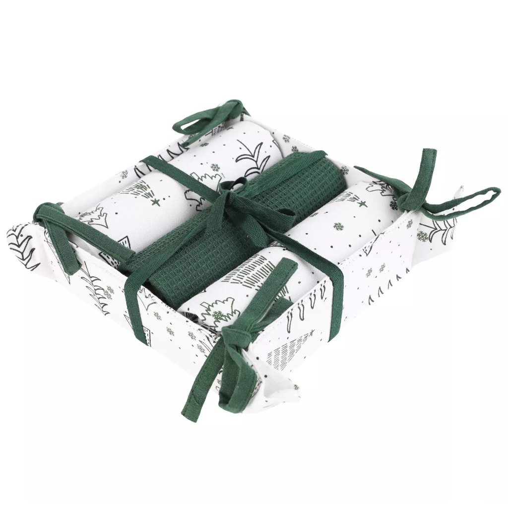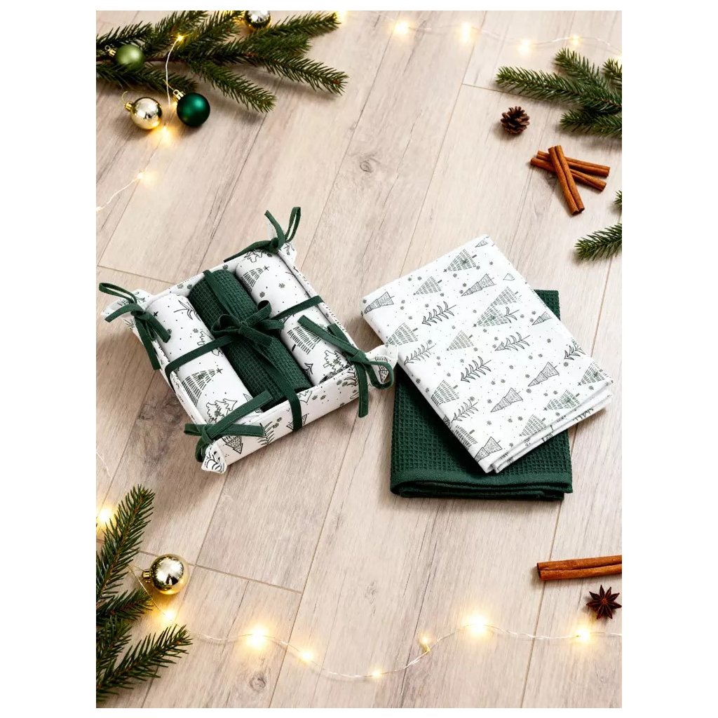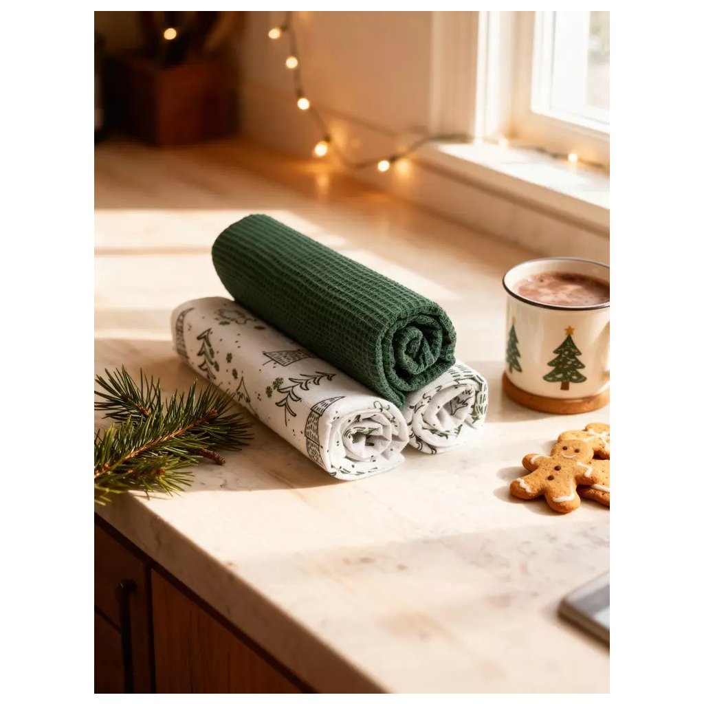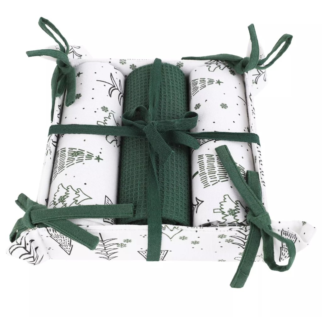 Sada kuchyňských utěrek v klasickém vánočním stylu. Sada obsahuje 3 utěrky o rozměrech 40x70 cm vyrobené ze 100% vysoce kvalitní bavlny. Sada obsahuje dva modely s vánočním motivem a jedna utěrka je sytě zelená s vaflovou strukturou, které dokonale absorbují vodu a rychle schnou. Celé je to zabaleno do elegantního látkového košíku, převázaného ozdobnou mašlí