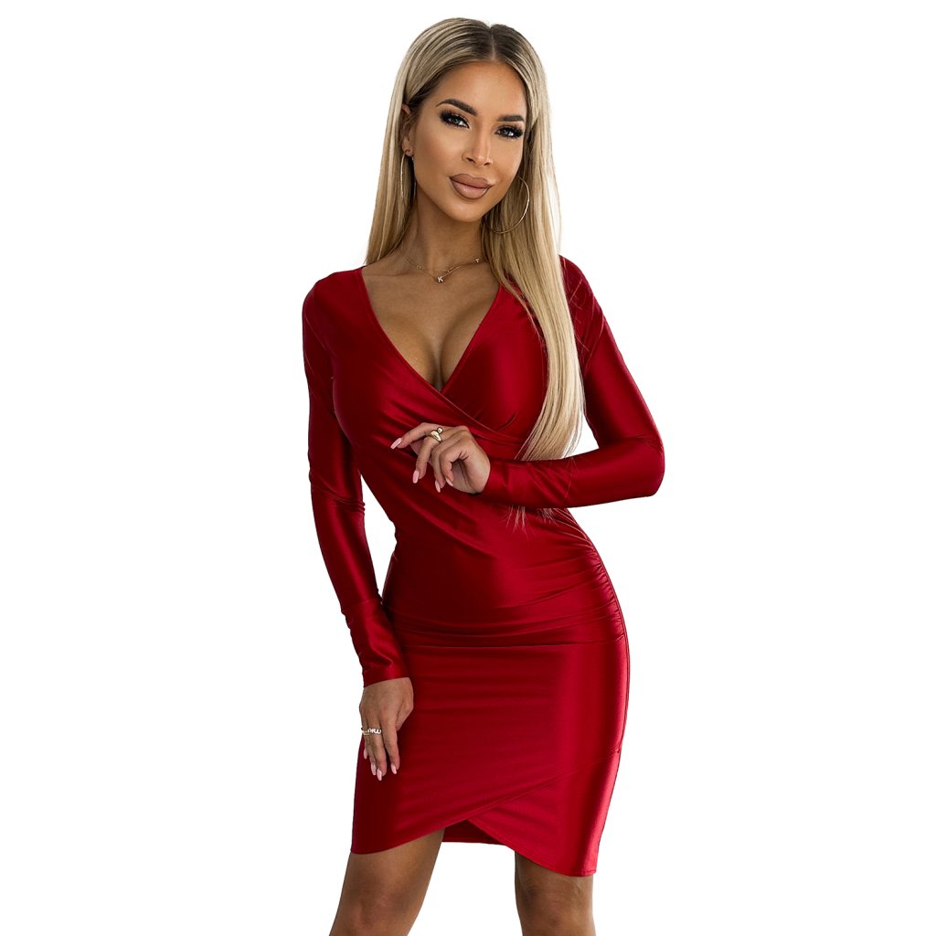 Saténové šaty s psaníčkovým výstřihem a dlouhým rukávem - Červené 477-2