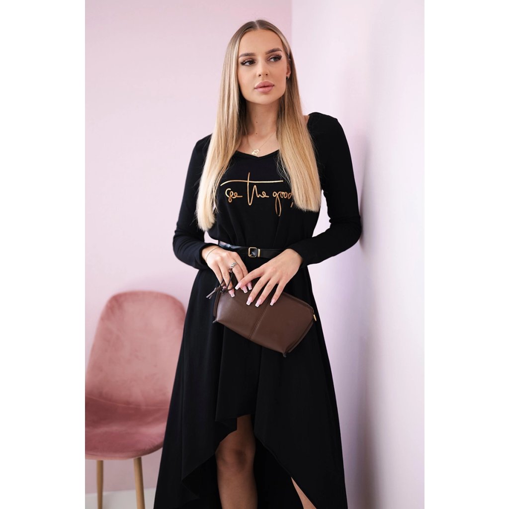 Představujeme vám pohodlné šaty s ozdobným páskem a módním nápisem na přední straně. Šaty mají delší záda. Šaty jsou vyrobeny z vysoce kvalitního materiálu. Velmi zajímavá nabídka pro všechny dámy. Velikost je univerzální a vyhovuje dámám, které nosí velikost S, M nebo L.