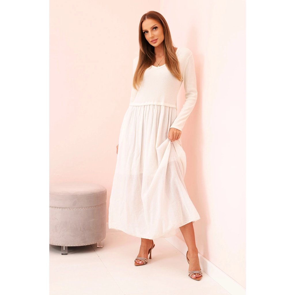 Lehké dámská šaty ušité z příjemné na dotek bavlněné pleteniny, která se krásně přizpůsobí postavě. Horní část z žebrovaného materiálu zvýrazňuje ženskou linii, zatímco spodní část s mírně nařaseným zakončením dodává lehkost. Hluboký V výstřih opticky prodlužuje krk a dlouhý rukáv zajišťuje pohodlí v chladnějších dnech.