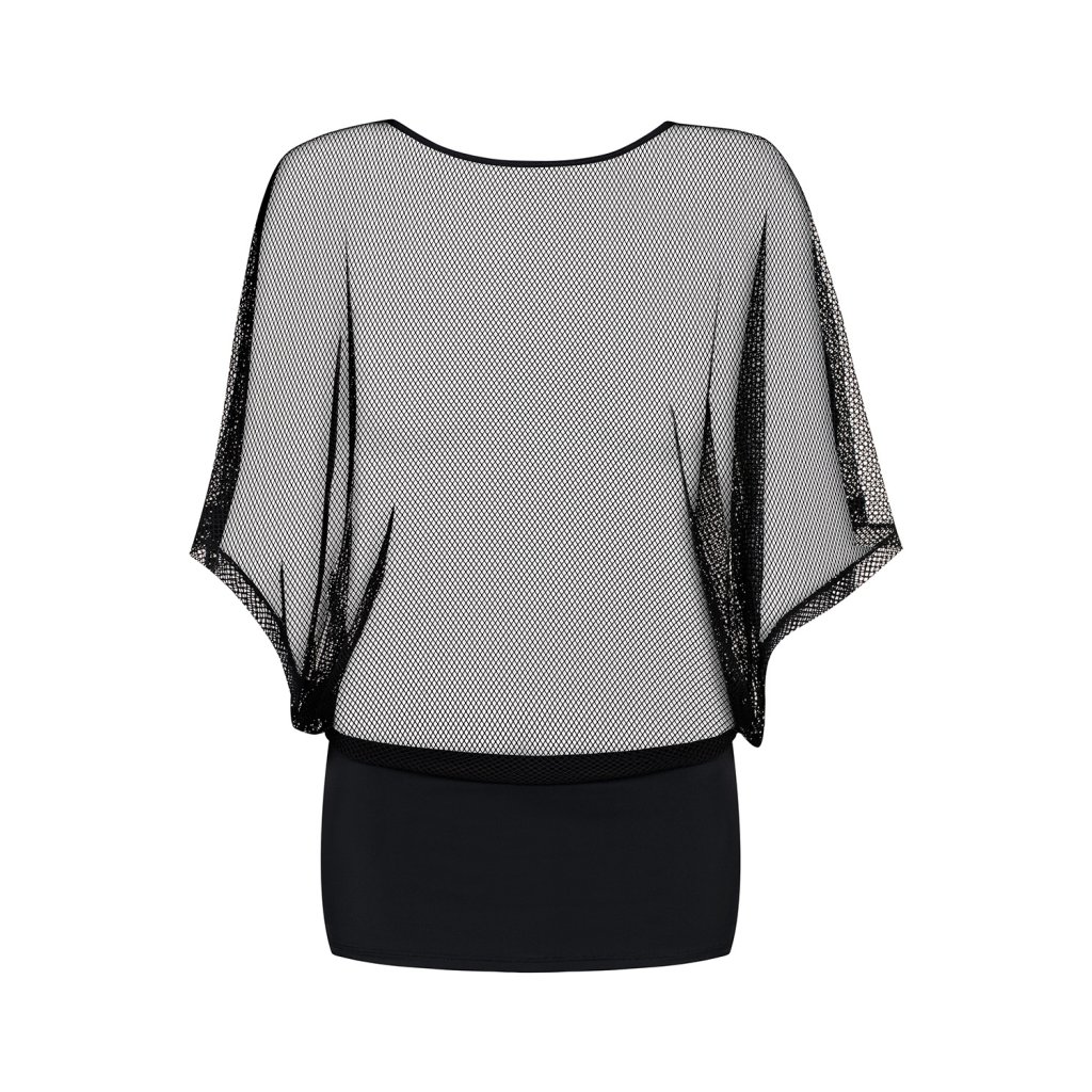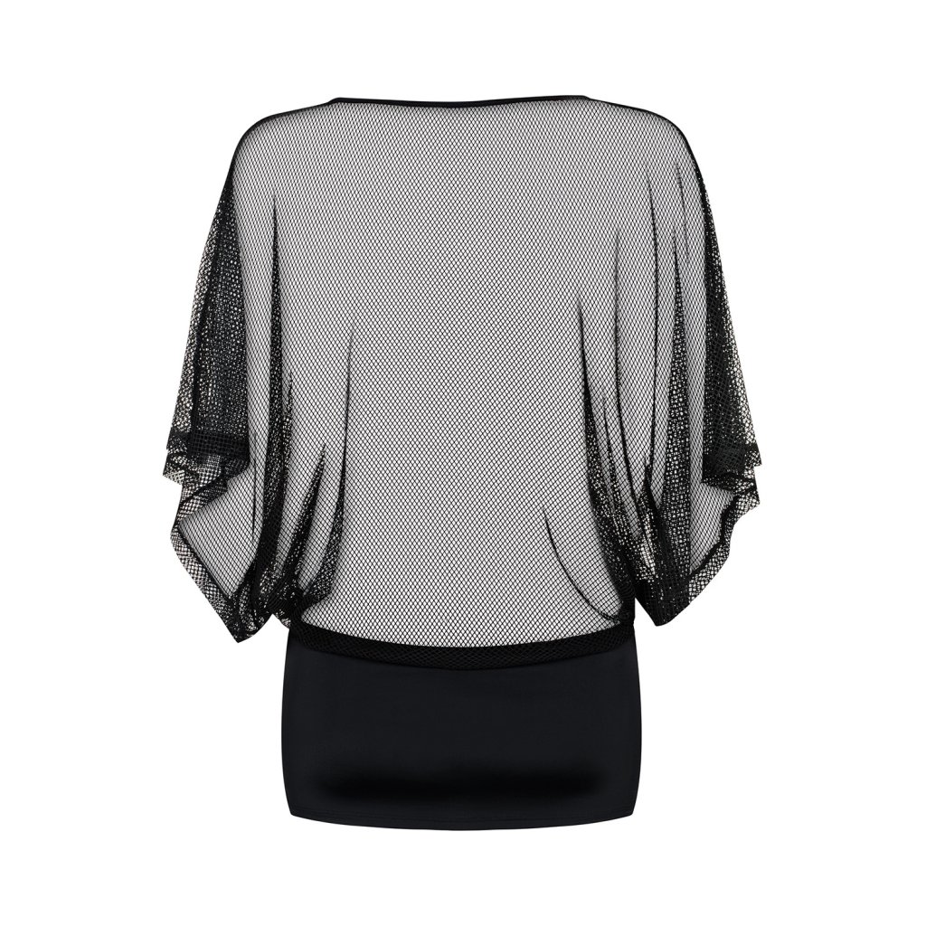Frivolní, sexy šatičky Punker dress Obsessive obsahuje top a mini sukni v jednom. Vrchní část je vyrobená ze síťoviny s volnými, širokými rukávy, spodní část je z příjemné, upnuté, elastické látky. Zadní strana je identická s přední.Součástí šatů jsou sexy tanga.Materiál: 90% Polyamid + 10% Elastan