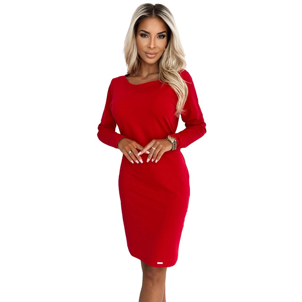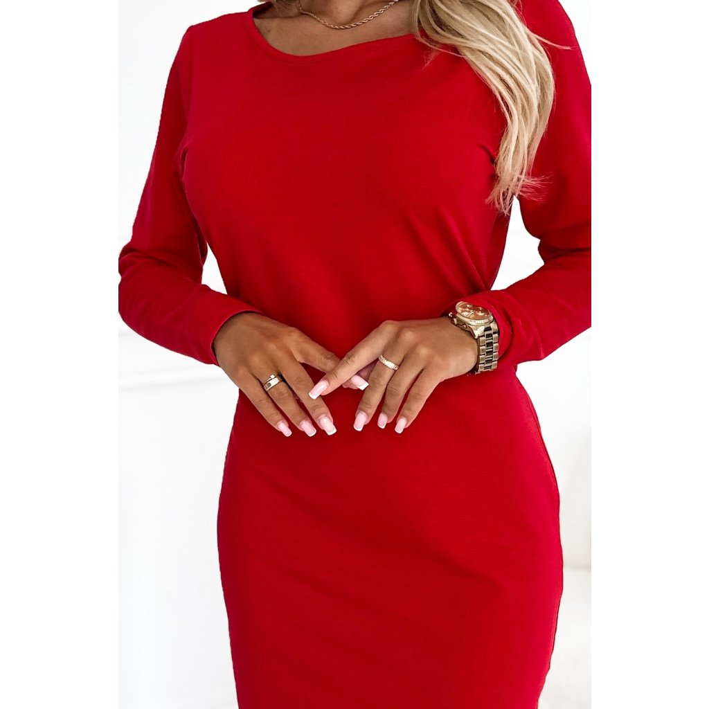 Šaty se širokým opaskem - lze jej vázat jak vpředu, tak vzadu. Příjemná na dotek - červené barvy. Značka numoco. Polská produkce.