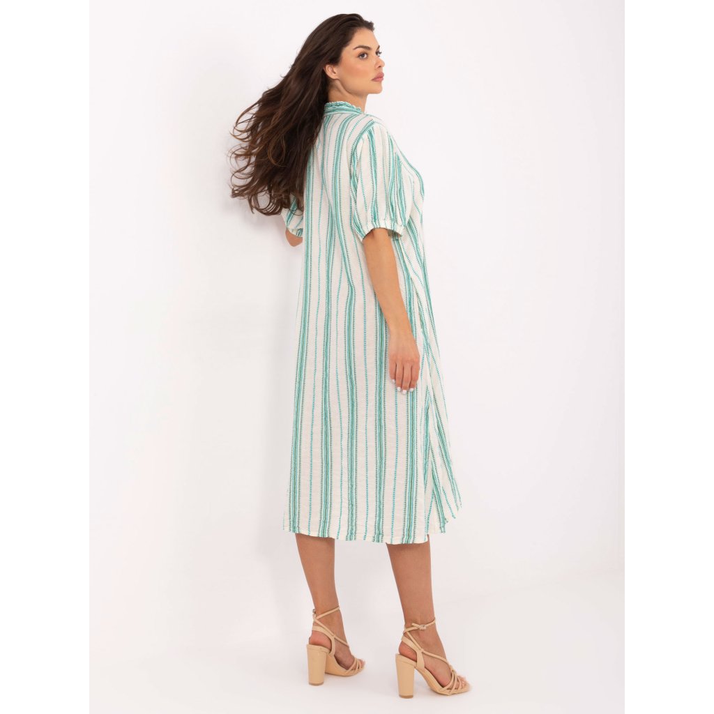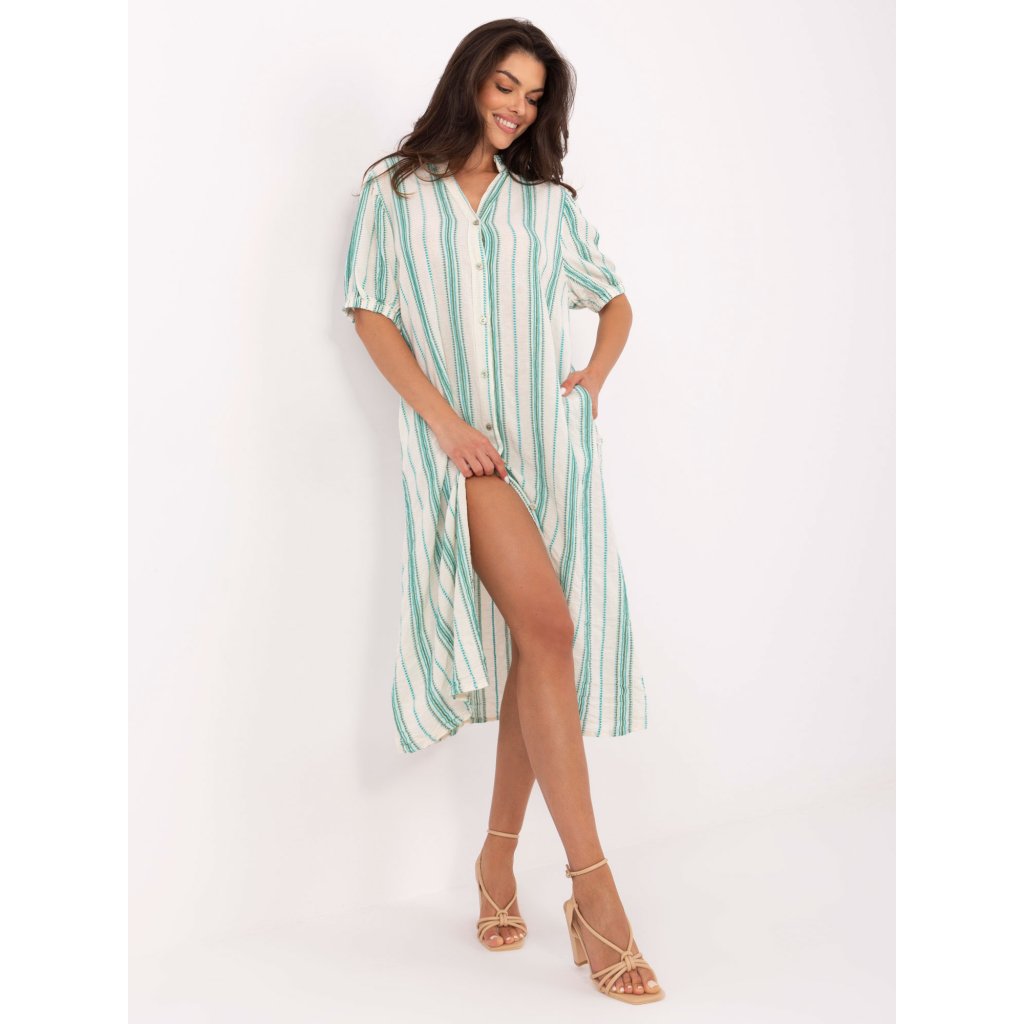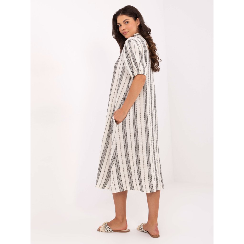 Míry šatů ve velikosti jedna: šířka v podpaží - 56 cm, šířka v pase - 54 cm, délka rukávu - 27 cm, šířka v bocích - 59 cm, celková délka - 118 cm.