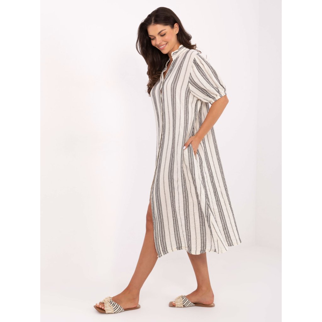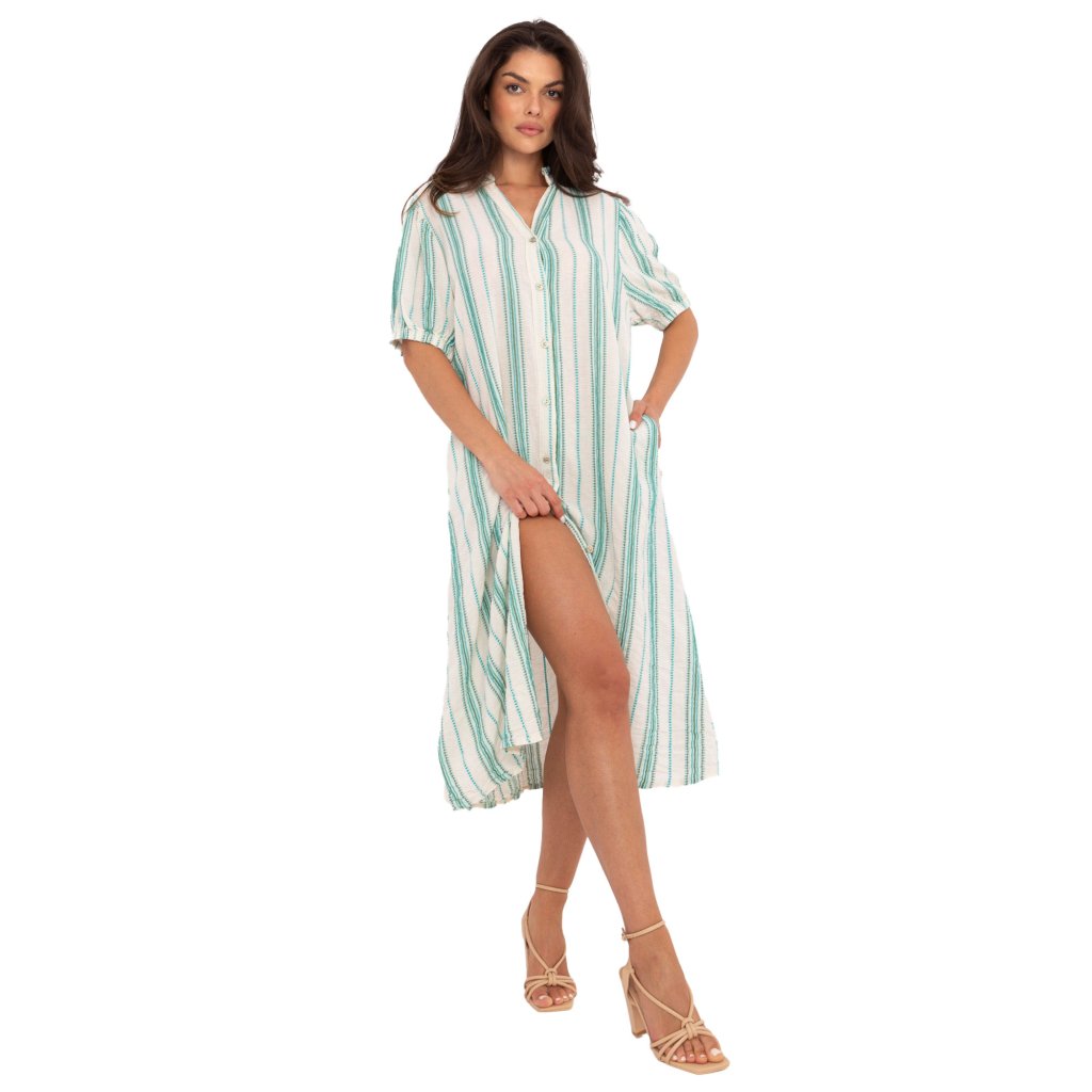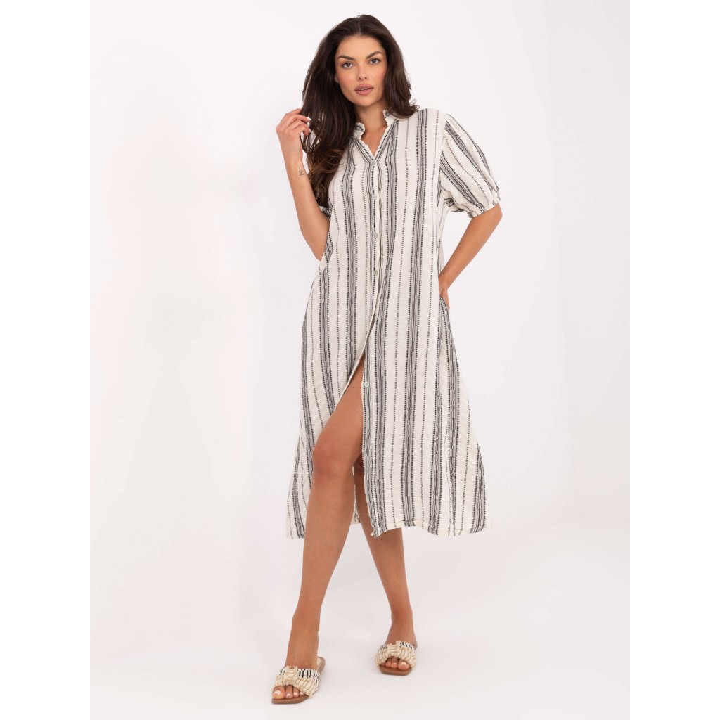 Míry šatů ve velikosti jedna: šířka v podpaží - 56 cm, šířka v pase - 54 cm, délka rukávu - 27 cm, šířka v bocích - 59 cm, celková délka - 118 cm.
