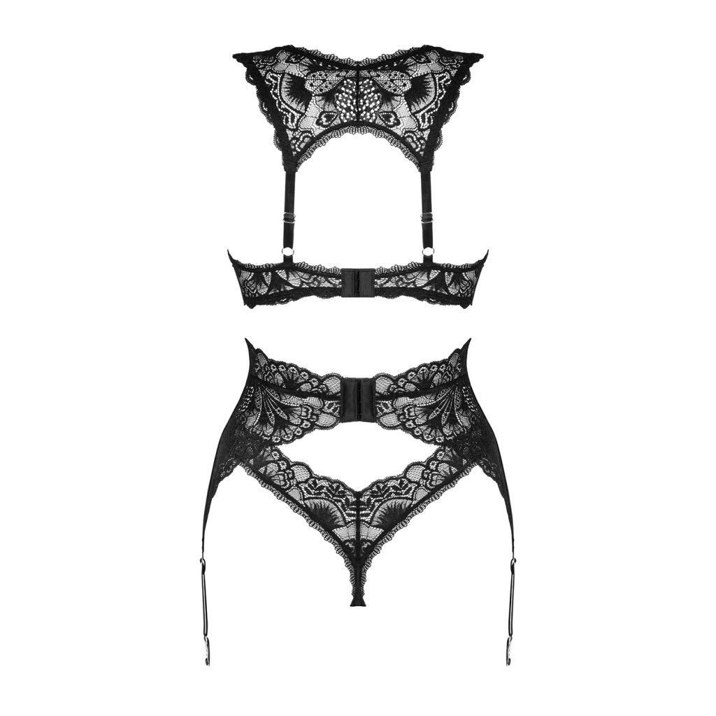 Donna Dream Set Sada Donna Dream je esencí ženskosti. Její jedinečný design zdůrazňuje ženské křivky a krajkové detaily dodávají celku šmrnc. Součástí soupravy je také podvazkový pás, který krásně zvýrazní vaše boky. Nezdržujte se a podívejte se, jaké nezapomenutelné okamžiky na vás čekají! Zjistěte další podrobnosti: - třídílná černá souprava obsahující podprsenku, tanga a podvazkový pás - perfektně padnoucí podprsenka díky vícestupňovému zapínání a nastavitelným ramínkům - kostice zvýrazňují poprsí - podvazkový pás se dvěma nastavitelnými ramínky - elegantní přívěsek - upoutá pozornost - elastická tkanina - zaručuje pohodlí(90% polyamid, 10% elastan)