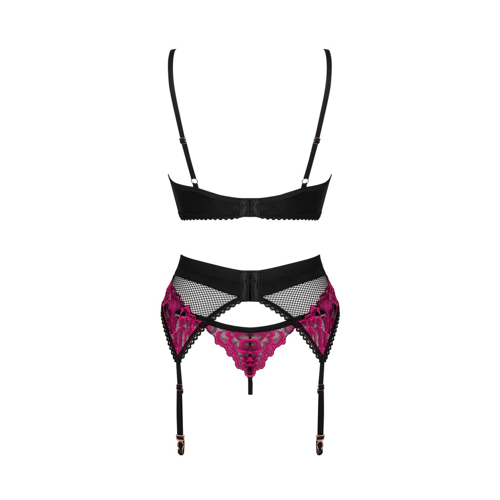 Třídílná sada Rosenta překypující sex-appealem Nechte na svém těle rozkvést růže v podobě podmanivé výšivky, která se dokonale hodí k černé. Podívejte se na podprsenku, která lákavě zvýrazní poprsí, šik podvazkový pás a tanga, která krásně odhalují hýždě. Nebojte se riskovat a jistě okouzlíte nejen sebe. Objevte jeho tajemství: - třídílný set Rosenty - obsahuje podprsenku, podvazkový pás a tanga -nastavitelné popruhy, podvazkové pásy a vícestupňové zapínání - záruka dokonalého padnutí - kostice v košíčcích - krásně zvýrazní prsa - lesklé doplňky z růžového zlata - poutavé detaily - motiv růže &ndash zajímavé provedení - pružný materiál &ndash záruka pohodlí Složení: 90% polyamid, 10% elastanDoplňkové parametry