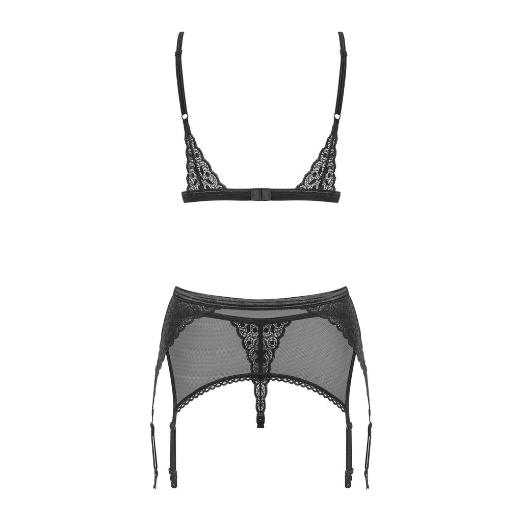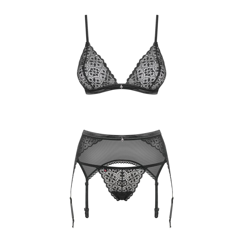Perfektní střih a perfektní vzory. Geometrická krajka dokonale zdůrazňuje ženské tvary. Příjemné materiály s dokonalou flexibilitou. Podprsenka má nastavitelná ramínka. Složení soupravy: podprsenka, podvazkový pás a krajkové tanga. Punčochy nejsou součástí setu - doporučujeme punčochy Shibu. Složení: 90% polyamid, 10% elastanDoplňkové parametry