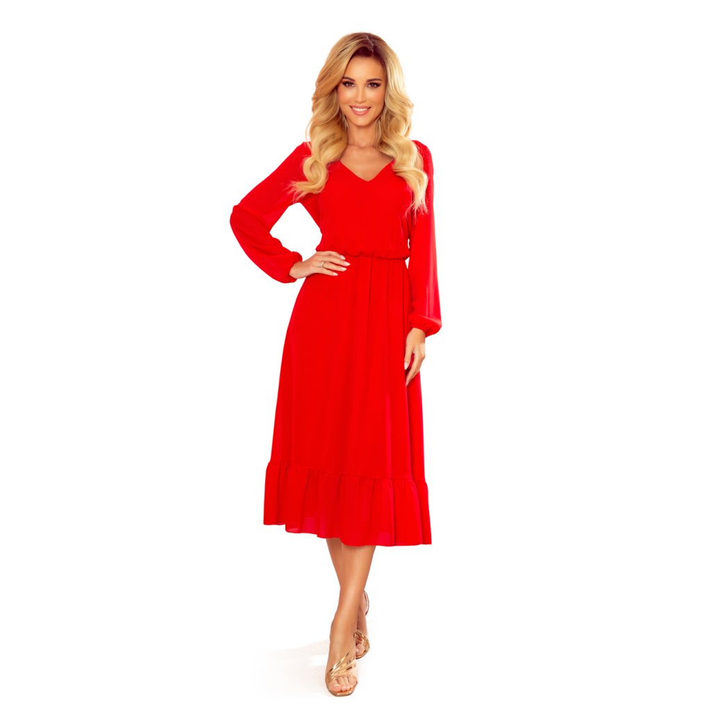 Šifónové šaty midi s výstřihem a límcem - Červené. Polská produkce. Značka Numoco.