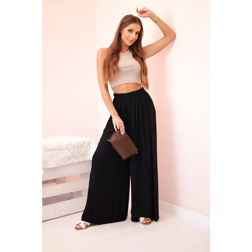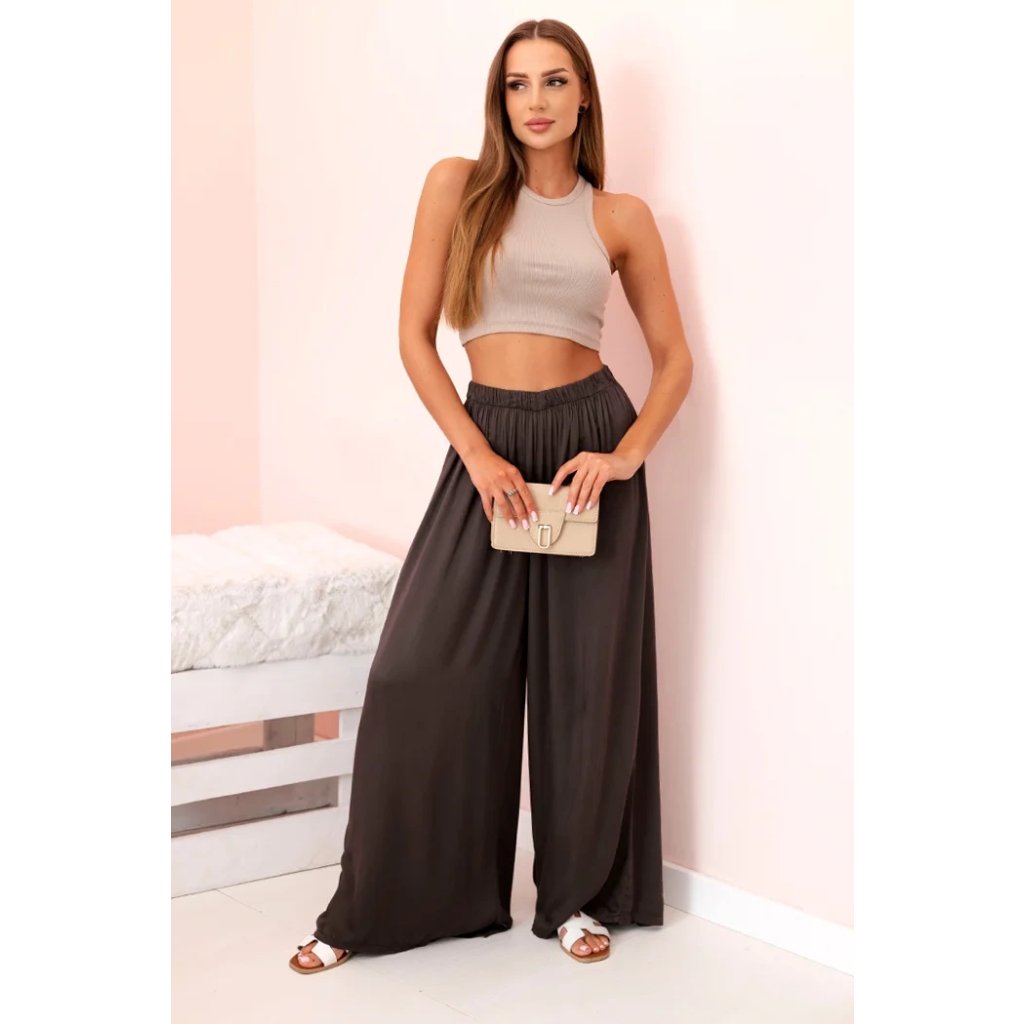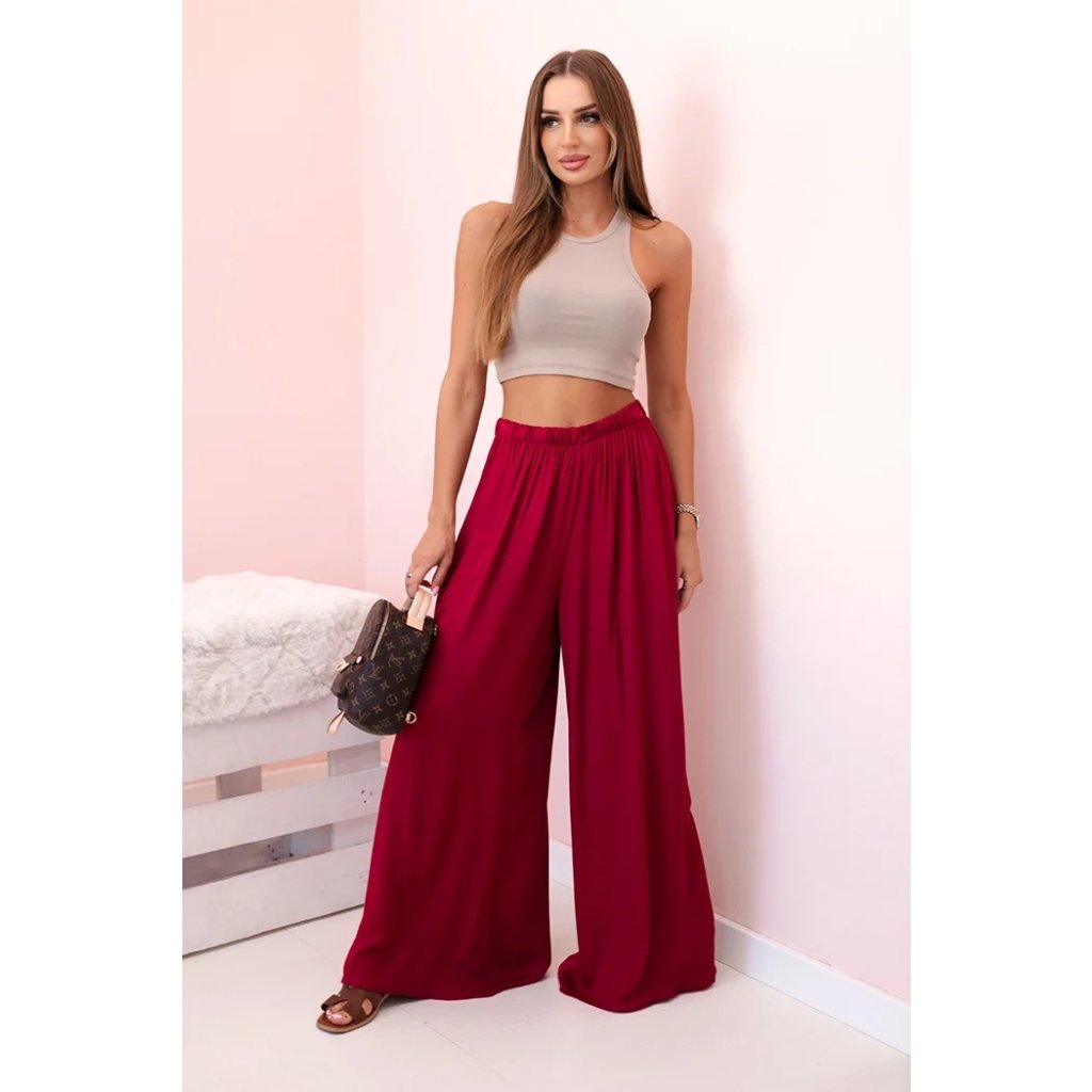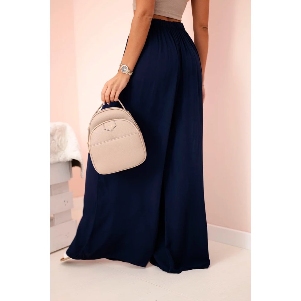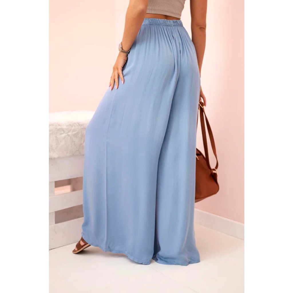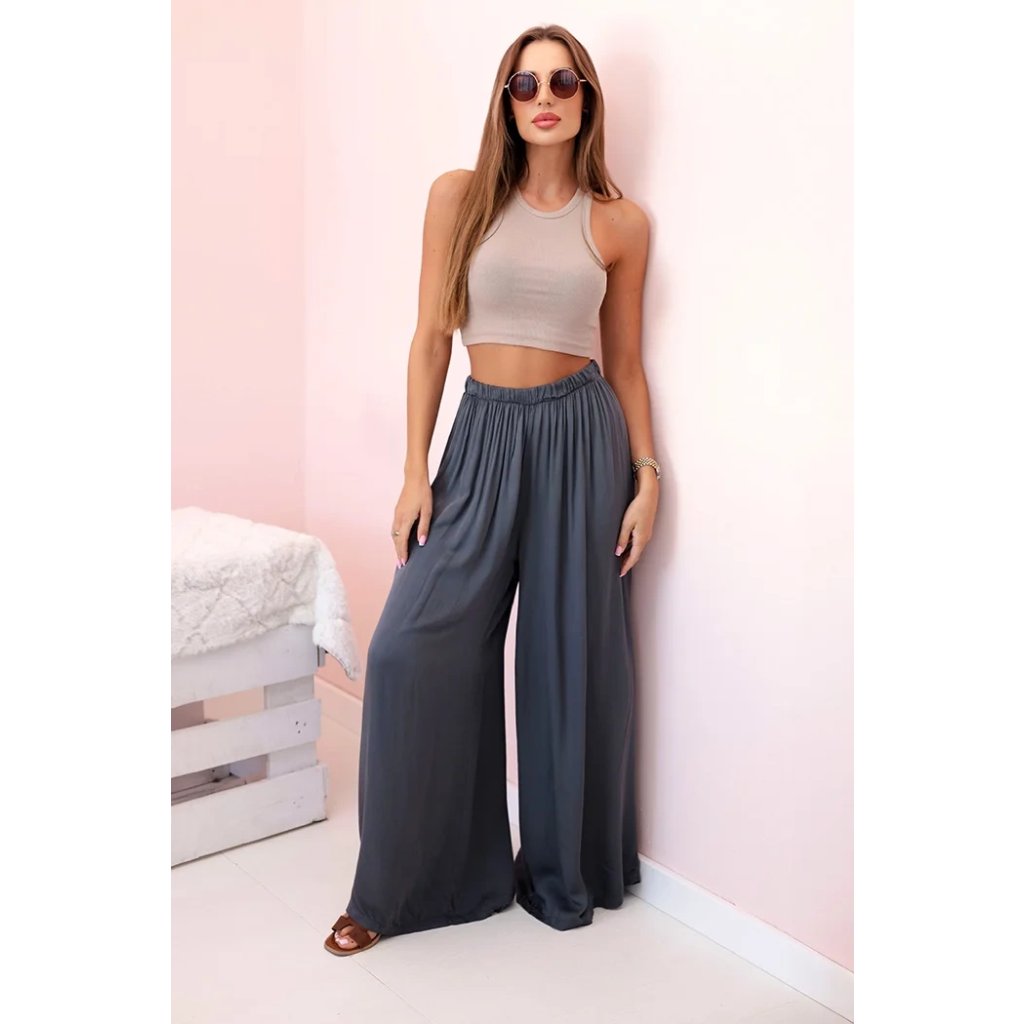 Tyto jedinečné dámské kalhoty kombinují pohodlí a styl. Jsou vyrobeny ze 100% viskózy, což je činí lehkými, vzdušnými a dokonale přizpůsobitelnými postavě. Široké nohavice dodávají elegantní, splývavý vzhled, který se hodí jak na každodenní nošení, tak pro výjimečné příležitosti. Díky elastické gumě v pase poskytují pohodlí a volnost pohybu. Můžete je kombinovat s elegantní halenkou nebo volným tričkem – vždy budou vypadat módně!
