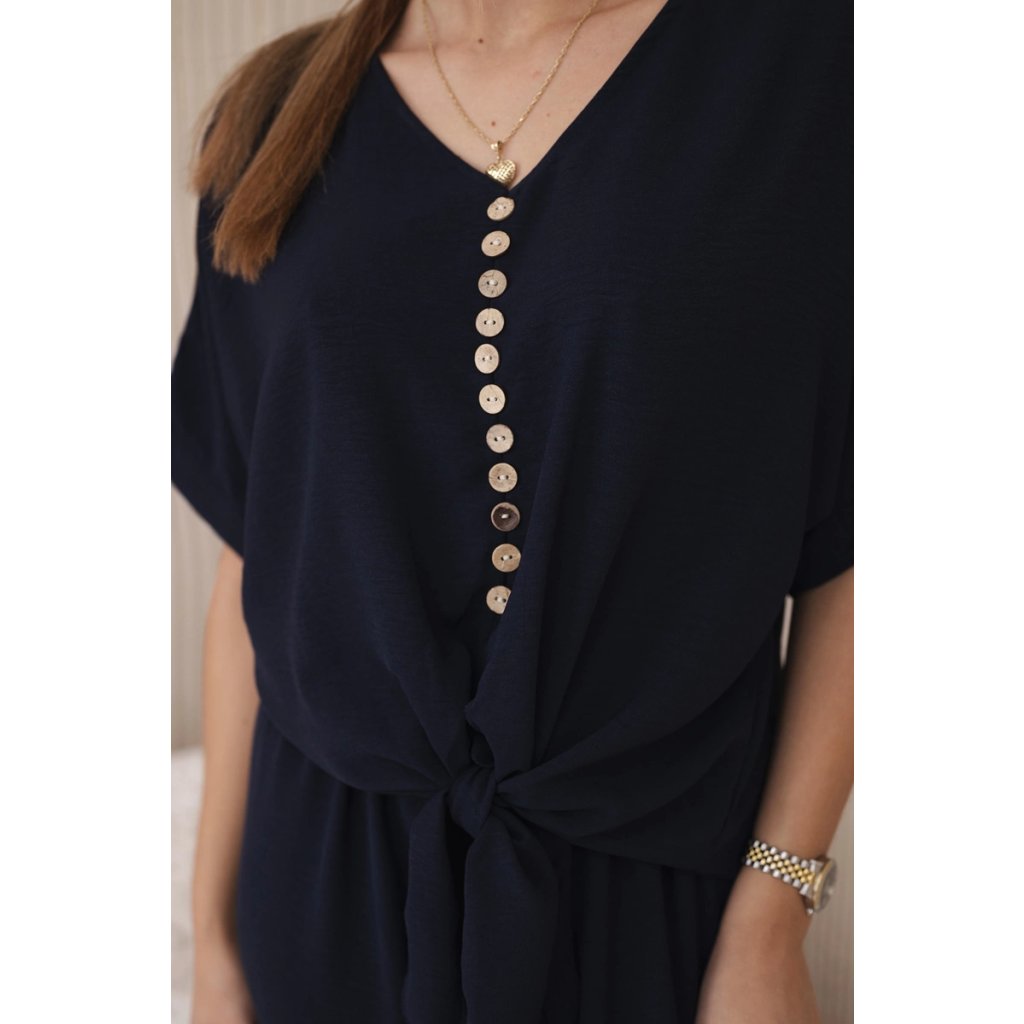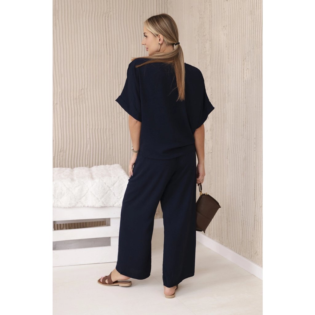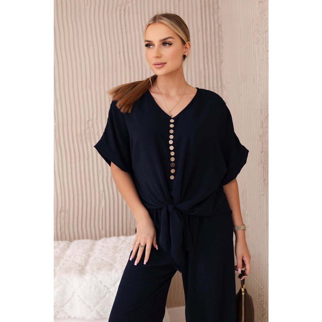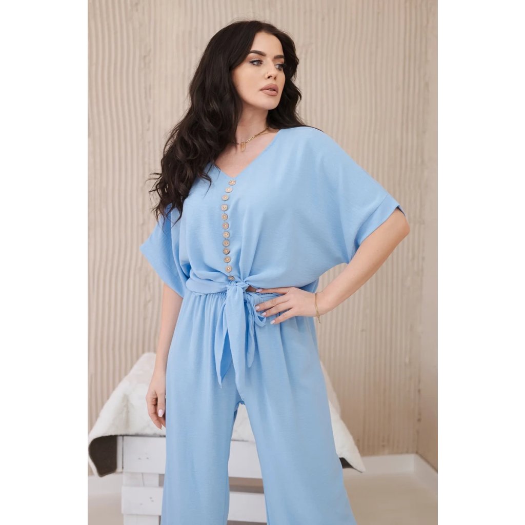 Italský komplet s halenkou zavazovanou vpředu a širokými kalhotami je ideální volbou pro ženy, které ocení pohodlí a styl vjednom. Halenka se zapíná vpředu na knoflíky, což jí dodává jemnou ženskost. Široké kalhoty z tkaniny příjemné na dotek pro volnost pohybu a pohodlné nošení. Takovou kompletní sadu můžete nosit při různých příležitostech - do práce, na rande nebo na setkání s přáteli. V kombinaci s elegantními botami a doplňky, jako je kabelka nebo šperky, vytvoří stylový a módní vzhled. Velikost je univerzální a vyhovuje dámám velikosti S, M nebo L.