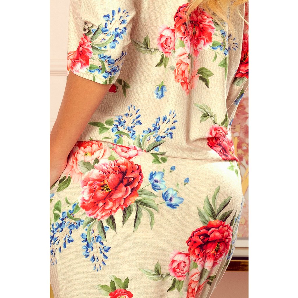 Sportovní šaty s 3/4 rukávy a kapsami - tisk - béžové prádlo + červené květy. Vyrobeno z pružného materiálu. Polský produkt. Značka Numoco.