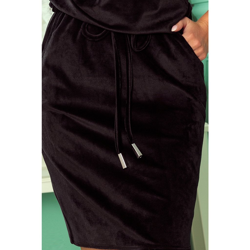 Sportovní šaty s vázáním vpředu, kapsami, výstřihem do tvaru lodi a 3/4 rukávy - barva: Černá. Polská produkce. Vyrobeno z velurového materiálu příjemného na dotek. Značka Numoco.