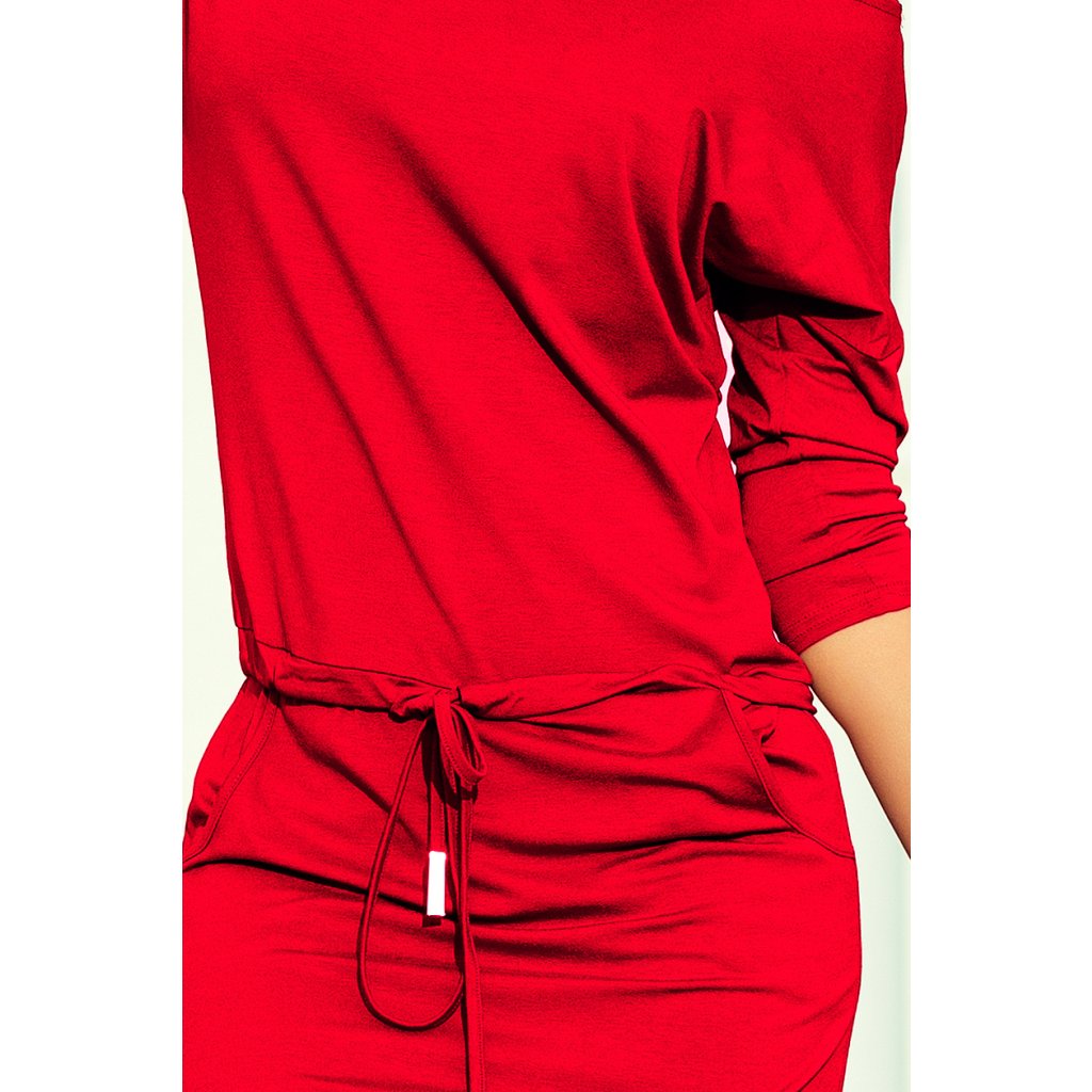 Sportovní šaty s vázáním vpředu, kapsy, lodní výstřih a 3/4 rukávy - červené. Polská produkce. Vyrobeno z příjemného elastického materiálu. Značka numoco.