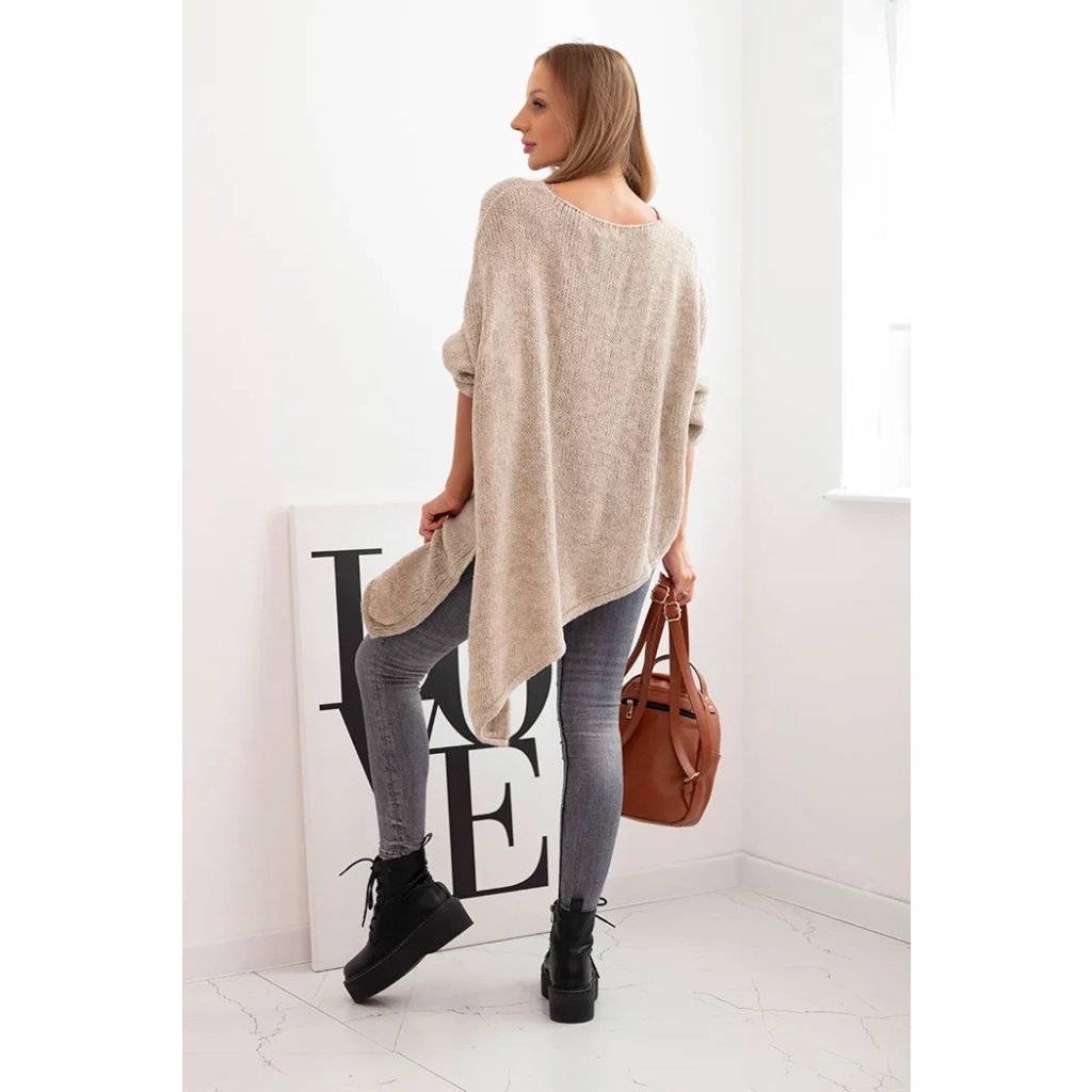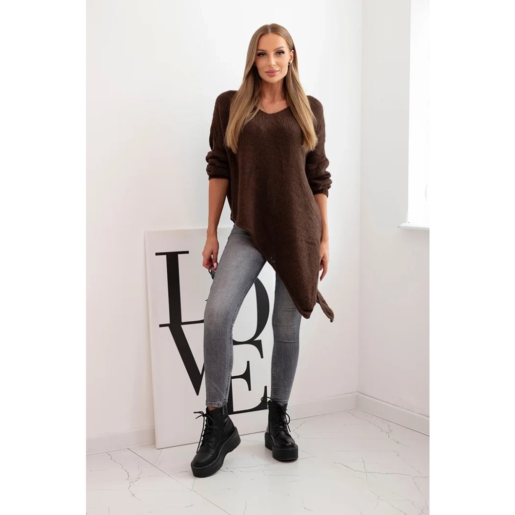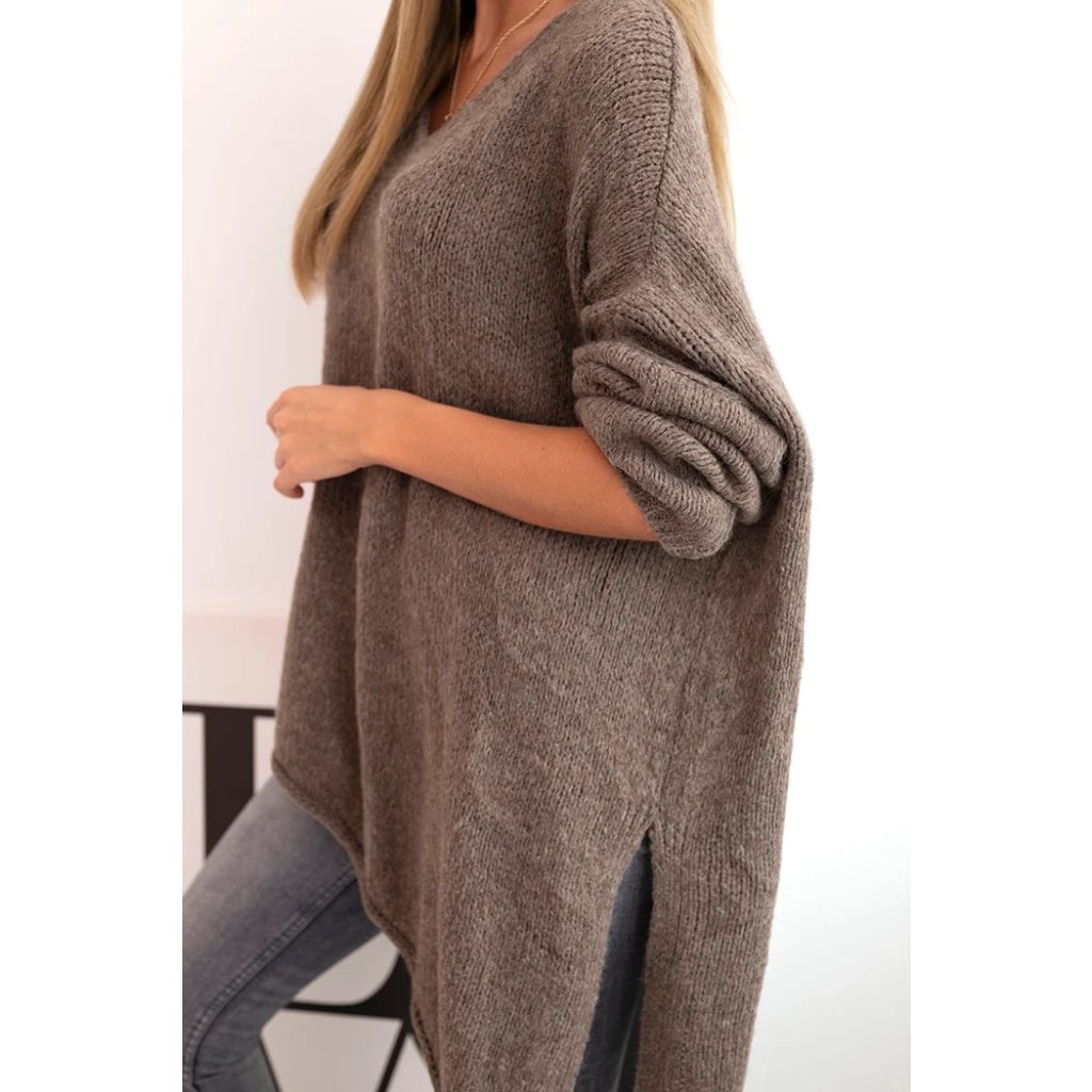 Tento dámský svetr s volným, asymetrickým střihem je nabídkou pro ženy, které si cení módního vzhledu a pohodlí. Vyrobený z měkké pleteniny s přídavkem vlny, skvěle se hodí na chladnější dny, poskytující teplo a komfort. Výstřih ve tvaru písmene V jemně zeštíhluje krk, a asymetrický spodní lem dodává celku moderní charakter.