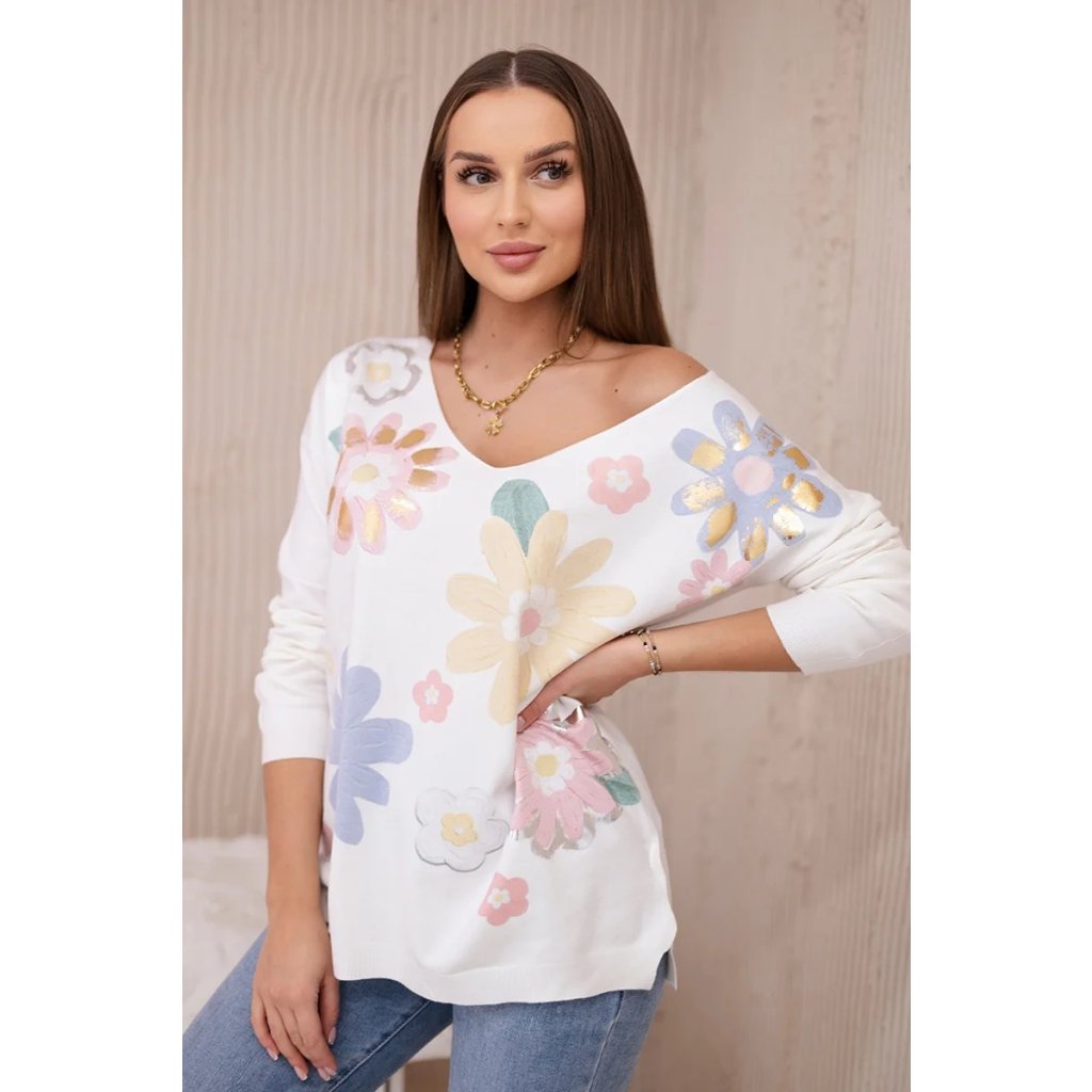 Svetrová halenka s barevnými květy je okouzlujícím a stylovým kouskem oblečení, jako stvořeným pro chladnější dny. Tato halenka vyrobená z měkkého materiálu poskytuje pohodlí a teplo a zároveň potisk v podobě barevných květin dodává svěžest a radost. Svetrová halenka je ideální pro chladné jarní dny a vytváří útulný a módní outfit. Barevné květy dodávají celku lehký a romantický ráz, díky čemuž se halenka hodí jak na ležérní, tak i na výjimečnější příležitosti. Tento model halenky je skvělou volbou pro lidi, kteří si cení pohodlí a zároveň chtějí vypadat stylově. Svetrová halenka s barevnými květy kombinuje funkčnost s módním designem a vytváří působivý a okouzlující outfit. Velikost je univerzální a bude vhodná pro ženy, které nosí velikost S, M nebo L.