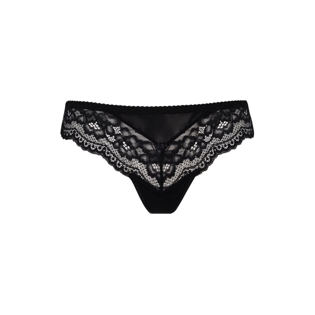 Sexy černá tanga vyrobeny z jemné krajky a jemné síťoviny. Střih kalhotek je velmi smyslný a okouzlující. Jemný výřez vzadu s malou mašličkou dodává koketérii.Složení: 79% polyamid, 11% bavlna, 10% elastan.
