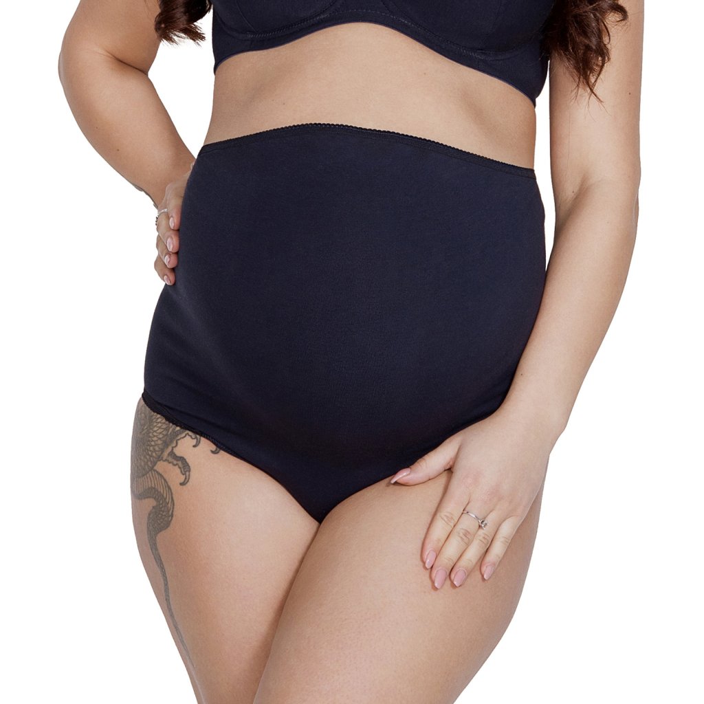 Těhotenské kalhotky s vysokým pasem.Kalhotky nejsou vyžehlené. Jsou vyrobeny z bavlněného úpletu, který je šetrný k pokožce. Přídavek elastických vláken zajišťuje trvanlivost střihu. Perfektně se hodí pod zakulacené bříško.