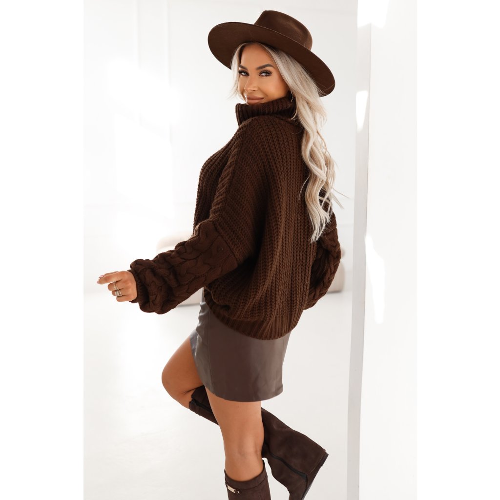Tento čokoládový svetr je nesmírně univerzální. Pro kontrast jej kombinujte s přiléhavým spodem – kožená mini sukně (jako na fotografii) nebo voskované úzké kalhoty budou fungovat skvěle. V casual verzi jej zkombinujte s oblíbenými džíny a kotníkovými botami. Je to ideální základ pro podzimně-zimní stylizace.