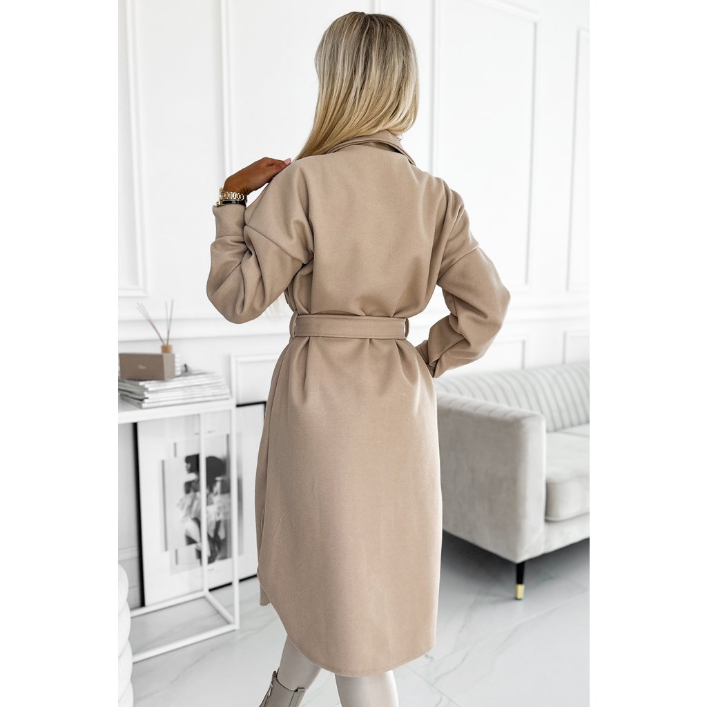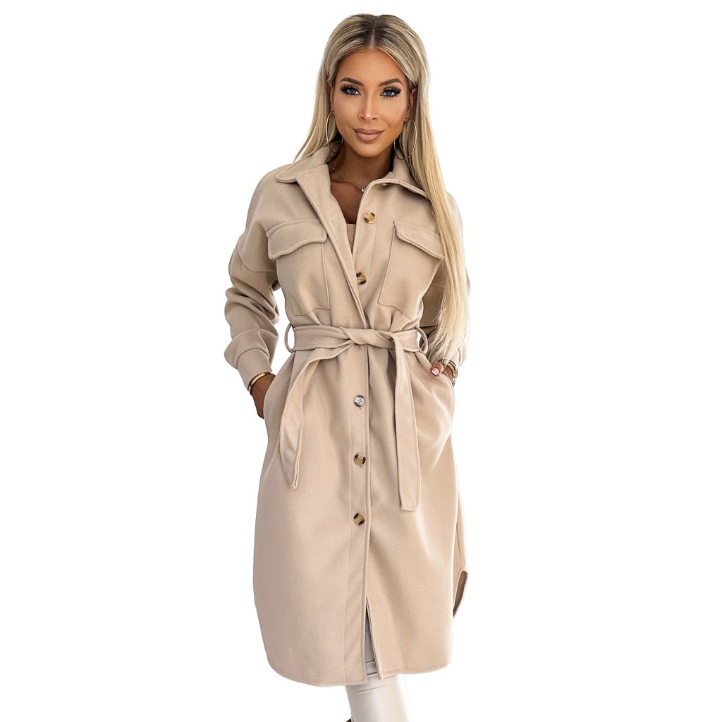 Teplý kabát s kapsami, knoflíky a zavazováním v pase - béžový 493-1
