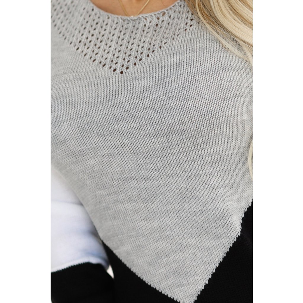 Trikolorní svetrové šaty s prolamovaným výstřihem - černá, bílá a šedá 584-1