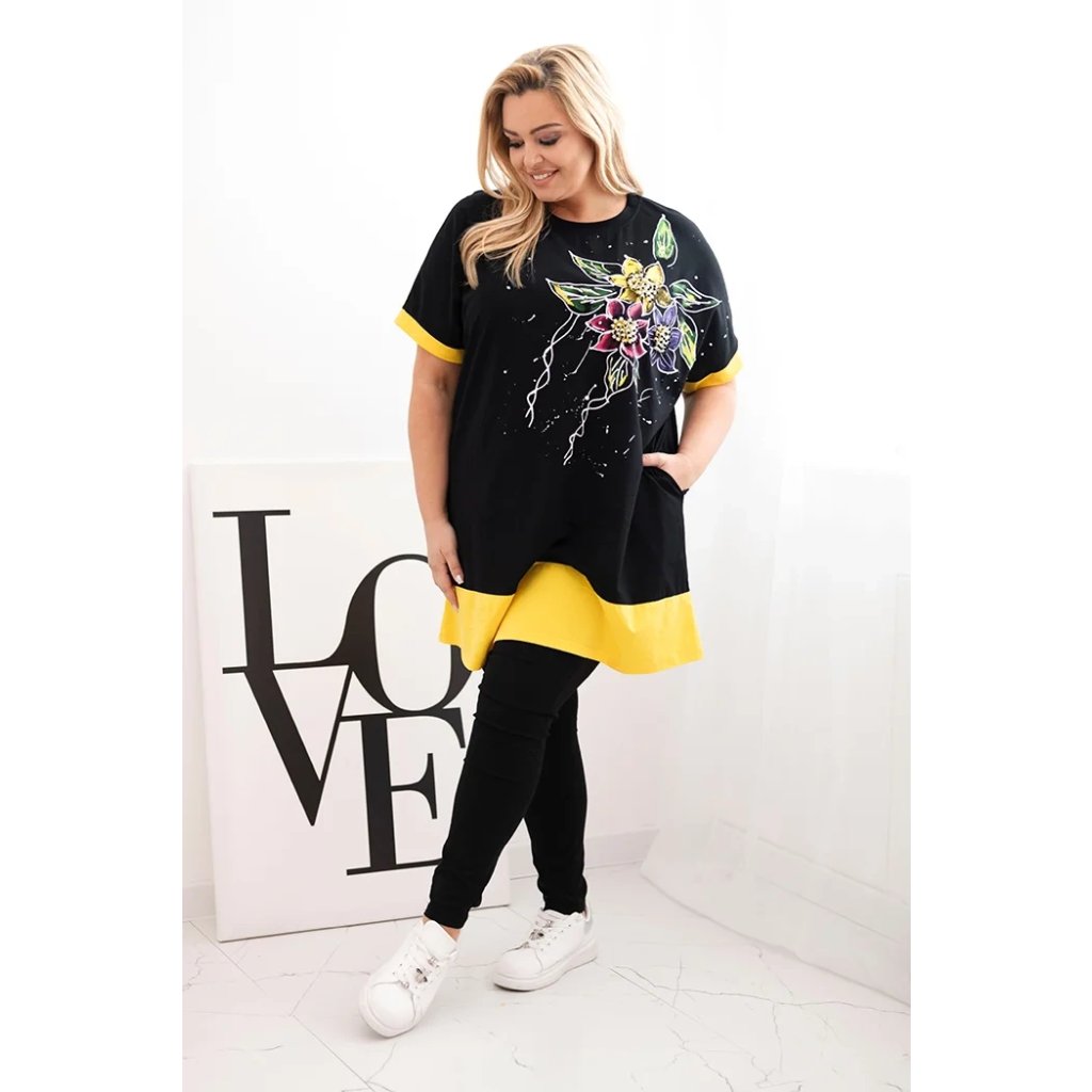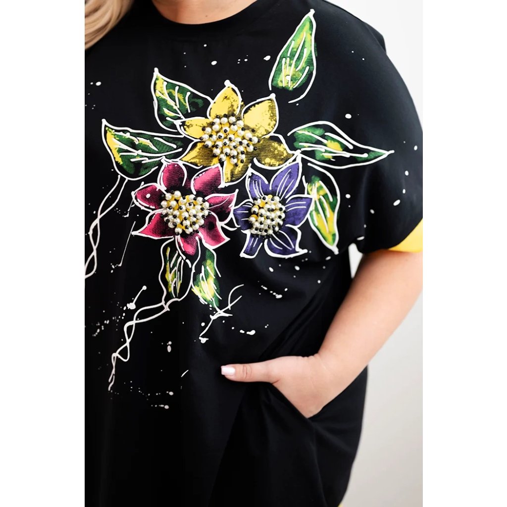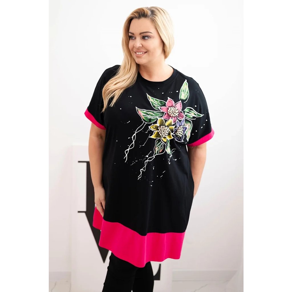 Pokud si ceníte kombinace ženského stylu a pohodlí, tato dámská tunika Plus Size splní Vaše očekávání! Model s volným střihem z příjemné bavlny s příměsí elastanu zajišťuje celodenní komfort. Květinový vzor zdobený perličkami dodává eleganci a kontrastní zakončení rukávů a spodního lemu tuniku odlišuje od ostatních modelů. Skvělá pro každodenní nošení, ale také vhodná pro slavnostnější příležitosti. Ideální pro ženy, které hledají stylová řešení ve velikosti Plus Size.