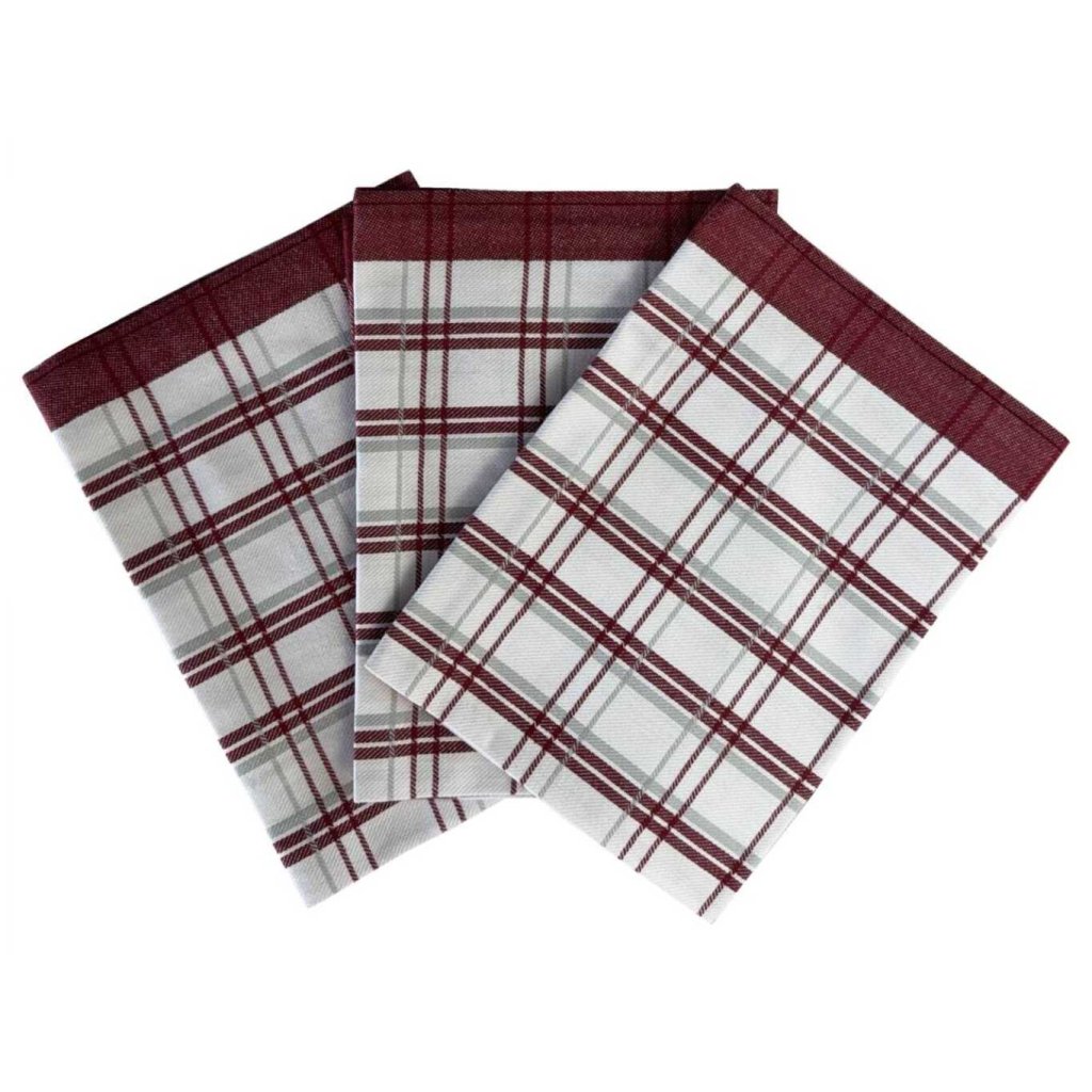 Sada Extra savých utěrek Tradiční káro bordó obsahuje tři žakárové utěrky vyrobené ze 100% egyptské bavlny. Utěrky jsou velmi savé, pevné a příjemné na dotek, díky čemuž jsou ideální pro každodenní použití.