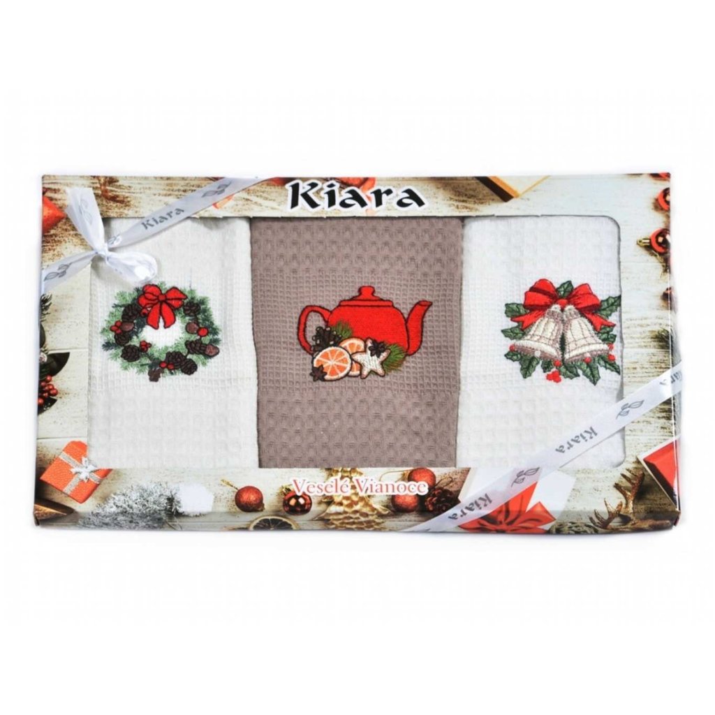 Luxusní sada tří vánočních utěrek v bílé a hnědé barvě s výšivkami vánočního věnce, červené konvičky a zvonečků. Elegantní balení s nápisem „Veselé Vánoce“ potěší každého milovníka sváteční atmosféry.