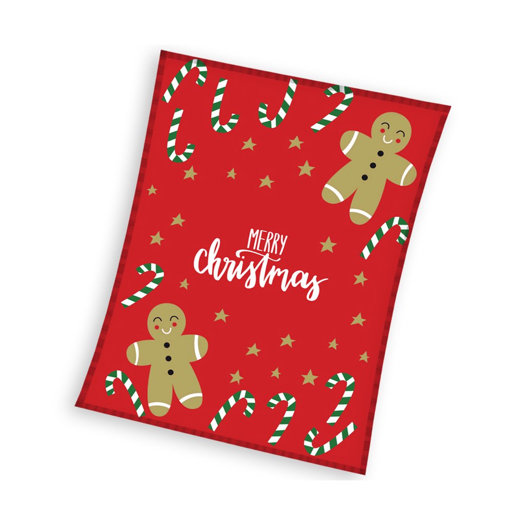 Vánoční deka Perníčci, je vyrobena z hřejivého fleecu, 100% polyesteru, s gramáží 180g/m²