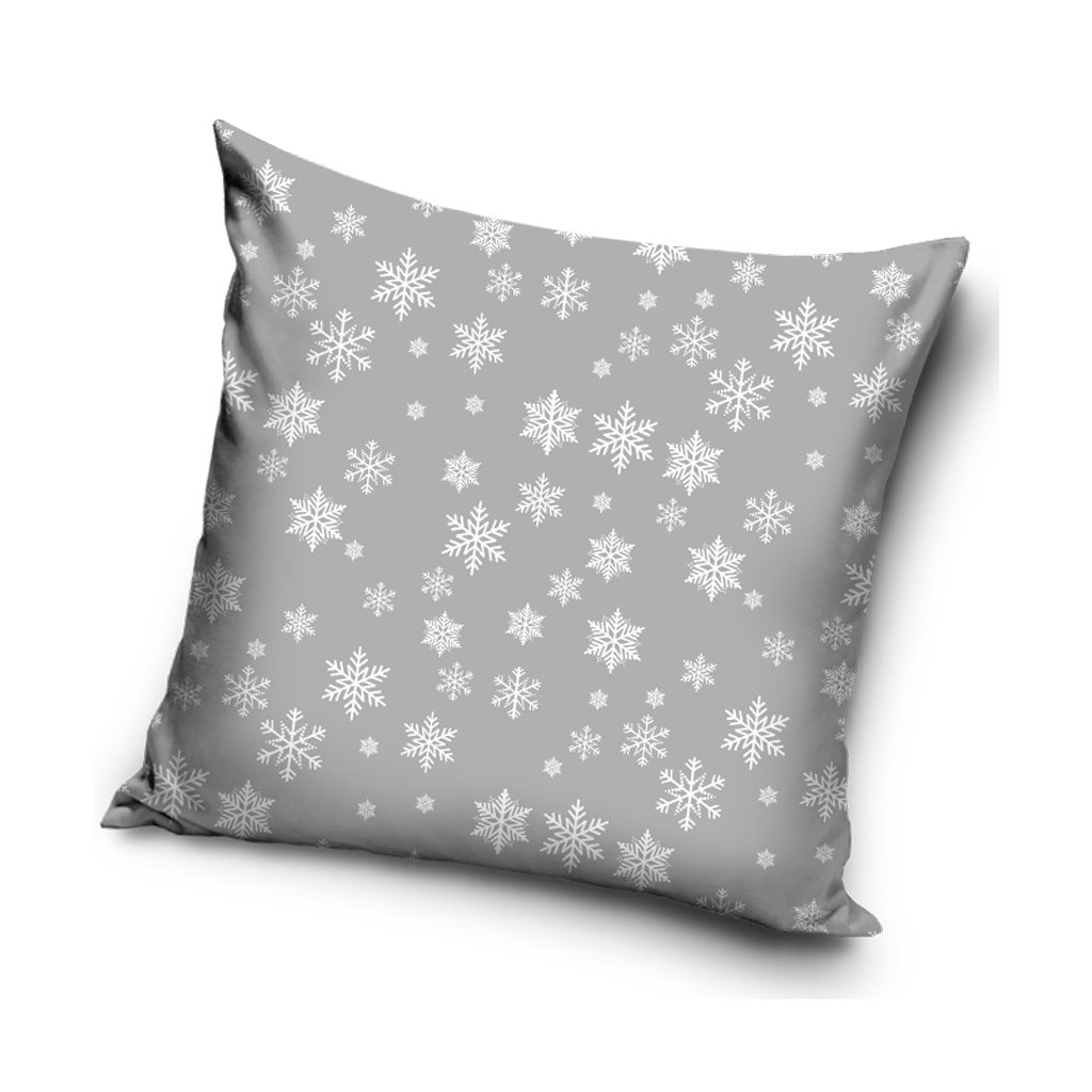 Povlak zdobí jemný zimní motiv bílých sněhových vloček různých tvarů a velikostí, které jsou rozprostřeny po světle šedém podkladu