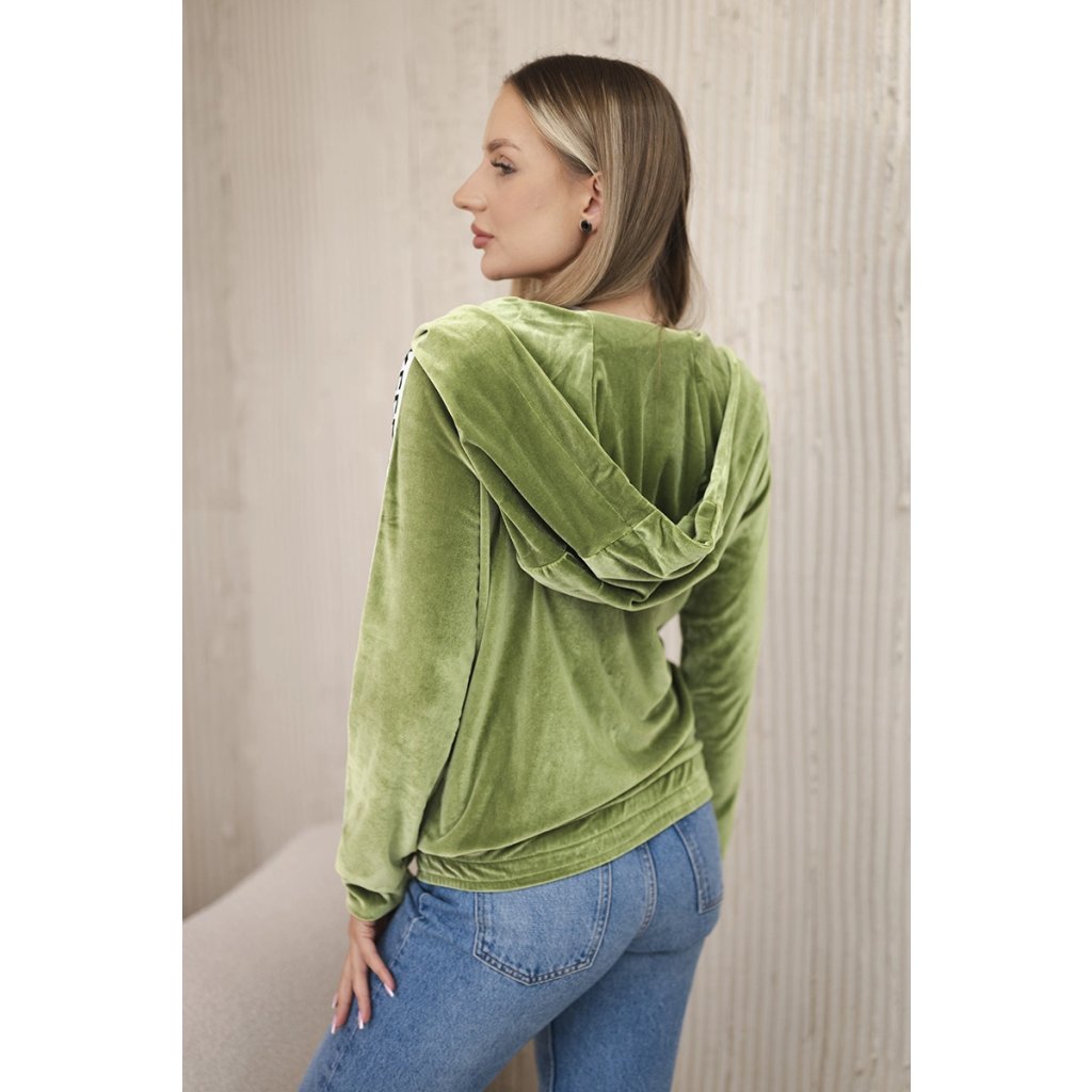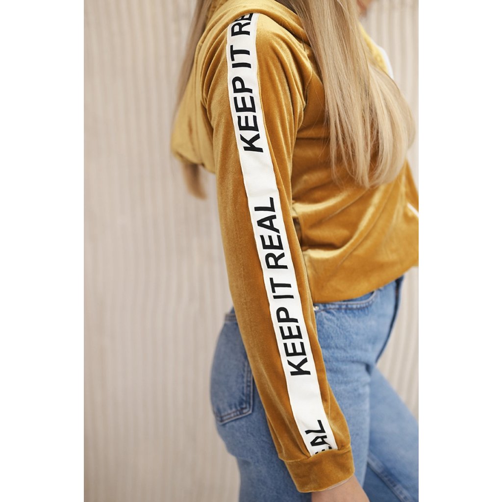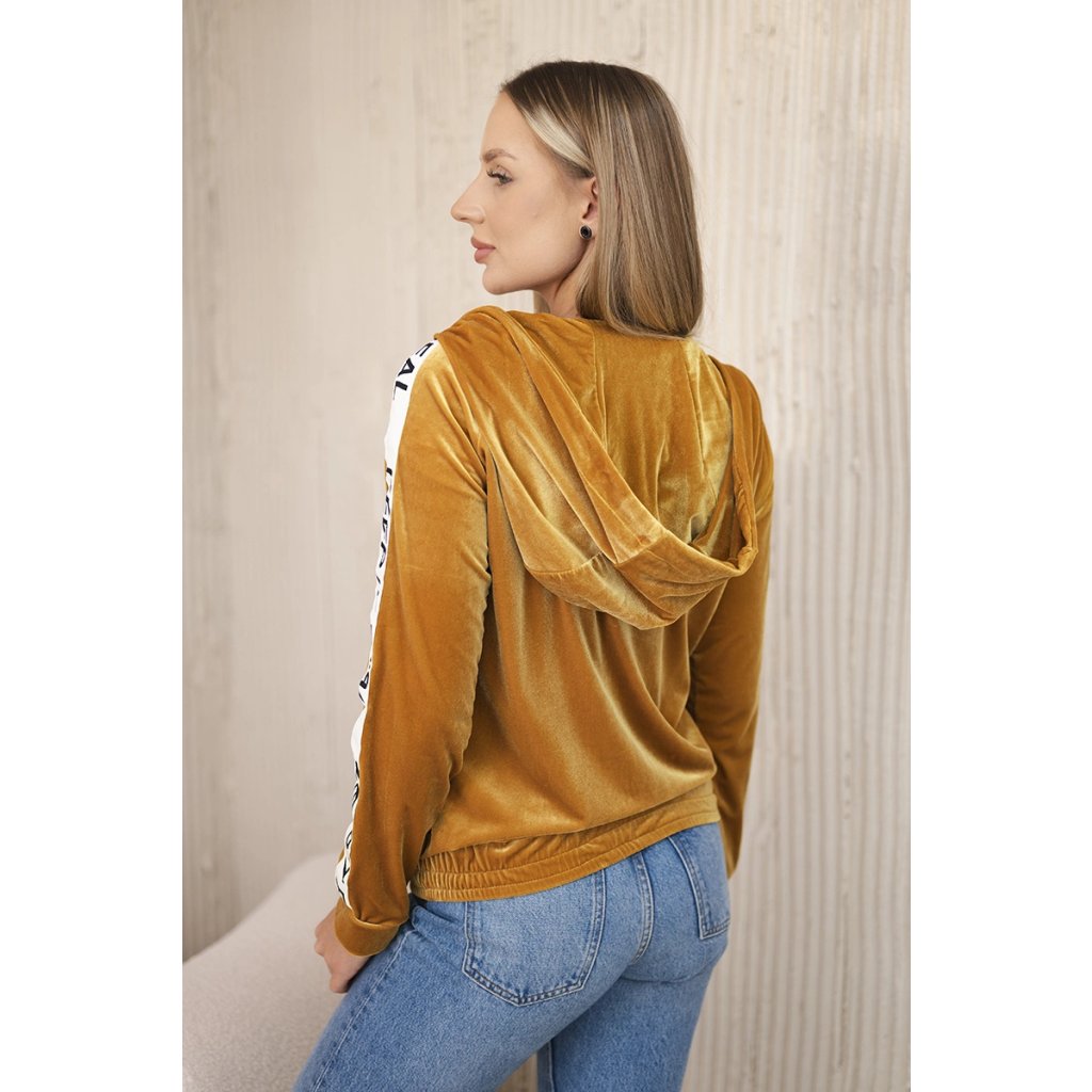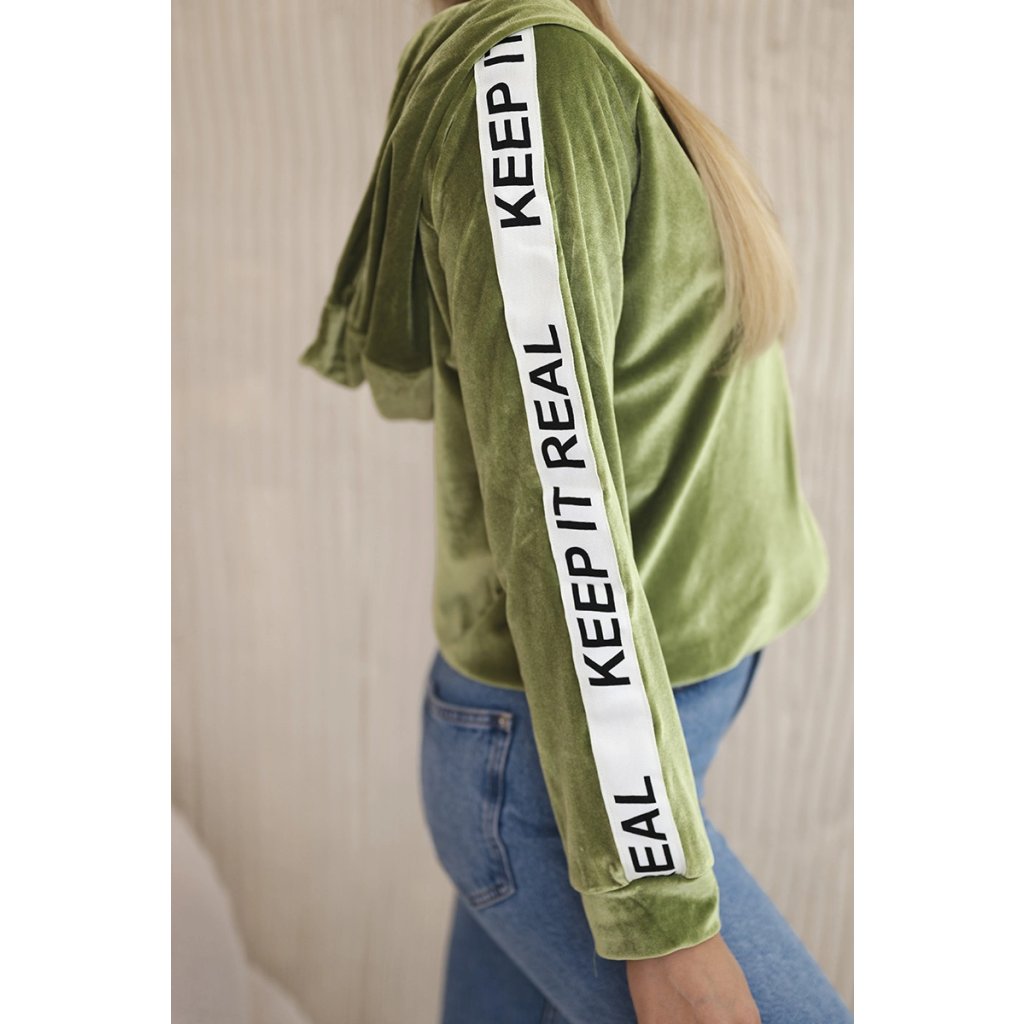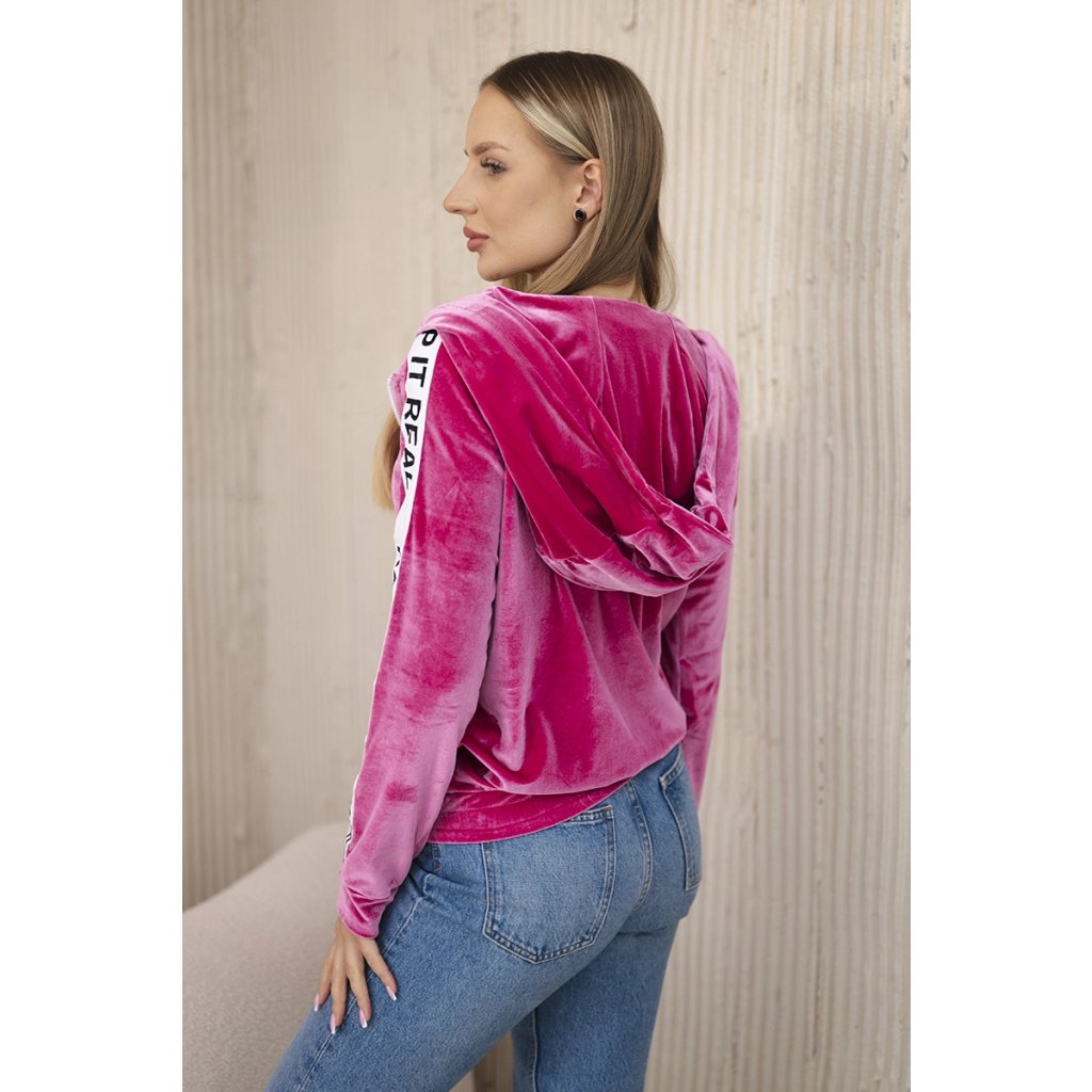 Představujeme vám módní mikinu s kapucí. Mikina vyrobená z veluru. Mikina bez kapes se zapínáním na zip. Na ramenou jsou ozdobné stuhy s nápisem. Mikina je ve spodní části zakončena gumou. Mikina je vyrobena z vysoce kvalitního materiálu. Velikost je univerzální a sedne ženám ve velikostech S, M nebo L.