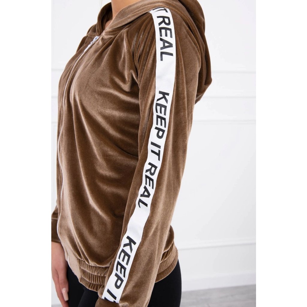 Představujeme vám módní mikinu s kapucí. Tato mikina bez kapes je vyrobena ze sametu a má zapínání na zip. Na ramenou je ozdobný branding. Spodní lem je zakončen gumou. Mikina je vyrobena z vysoce kvalitního materiálu. Univerzální velikost, vhodná pro ženy ve velikostech S, M nebo L.
