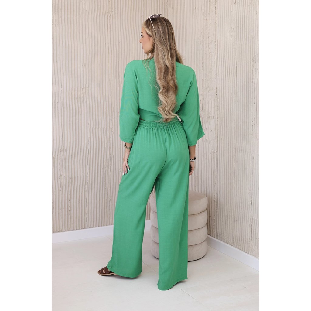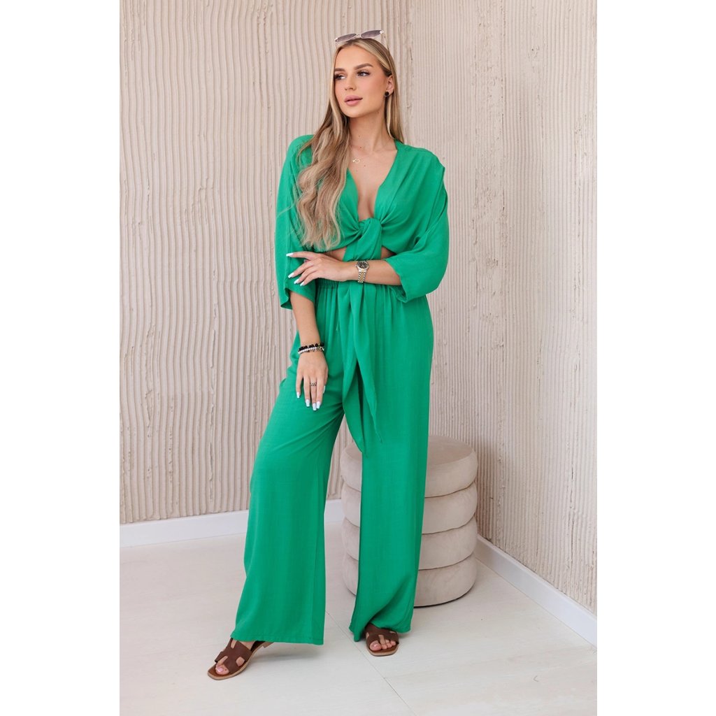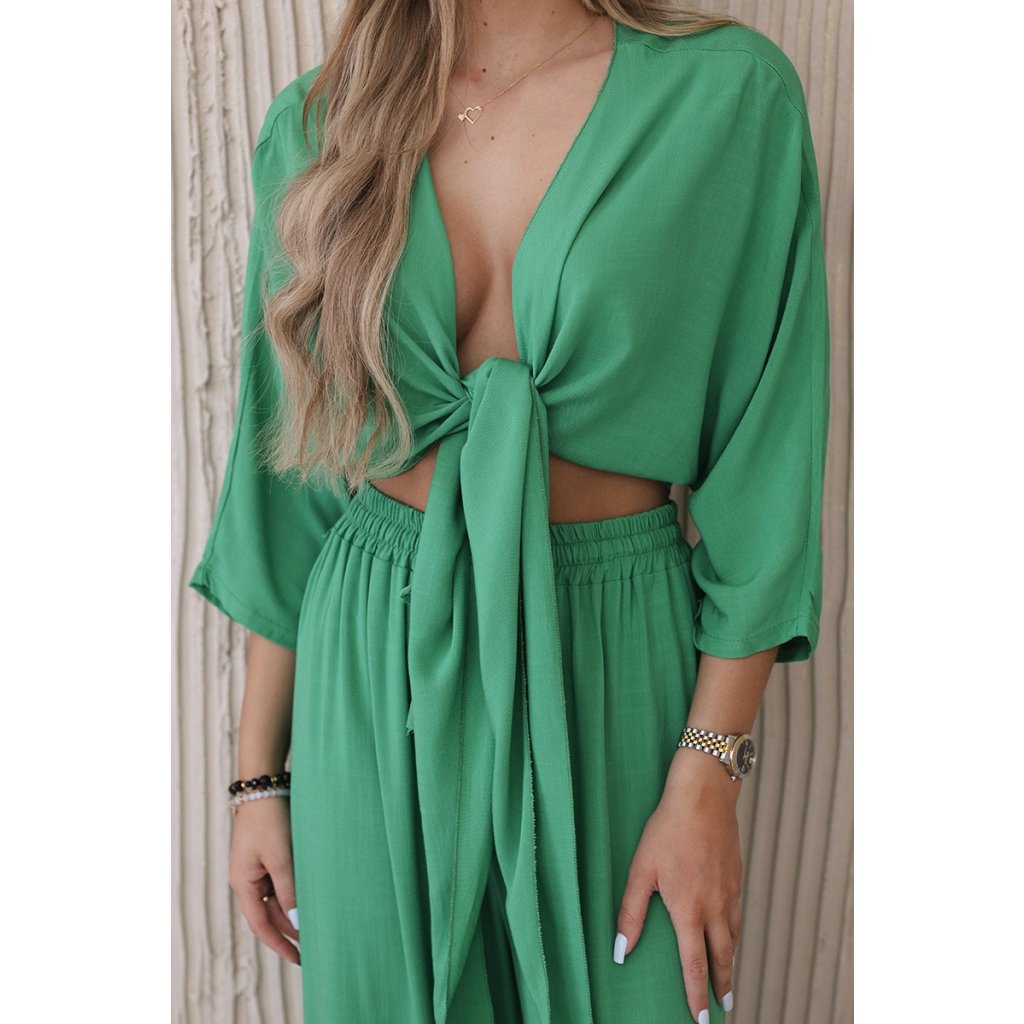 Viskózový komplet skládající se z halenky se zavazováním dole a kalhot je ideální variantou pro ty, kteří hledají pohodlí i styl v jednom kompletu. Halenka uvázaná ve spodní části dodává celému stylingu šarm a lehkost a umožňuje vám upravit její délku podle vašich preferencí. Viskózový materiál zajišťuje příjemný pocit při nošení a skvělou prodyšnost, díky čemuž je komplet ideální pro letní dny. Viskózové kalhoty budou nejen pohodlné, ale také lehké a jemné k pokožce. Mají volnější střih, ladící s ležérním stylem, dodávají celku elegantní vzhled. Takový set je perfektní volbou pro mnoho různých příležitostí, od každodenních procházek až po formálnější události, v závislosti na stylu a doplňcích, se kterými je kombinován. Velikost je univerzální a bude vhodná pro ženy velikosti S, M nebo L.