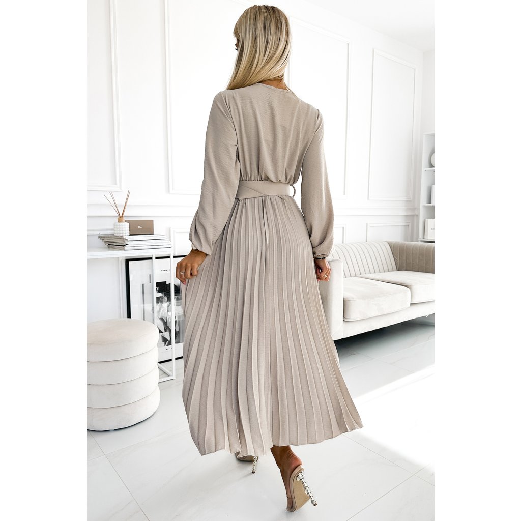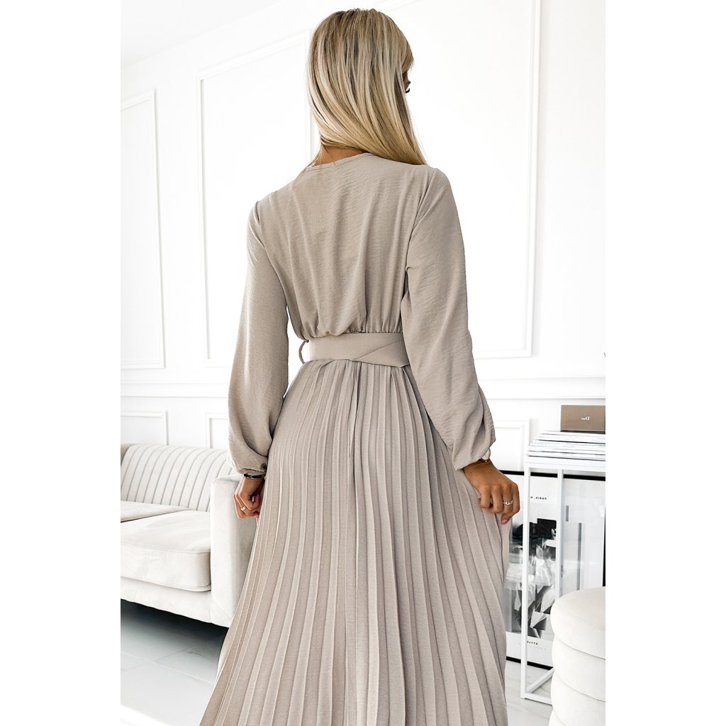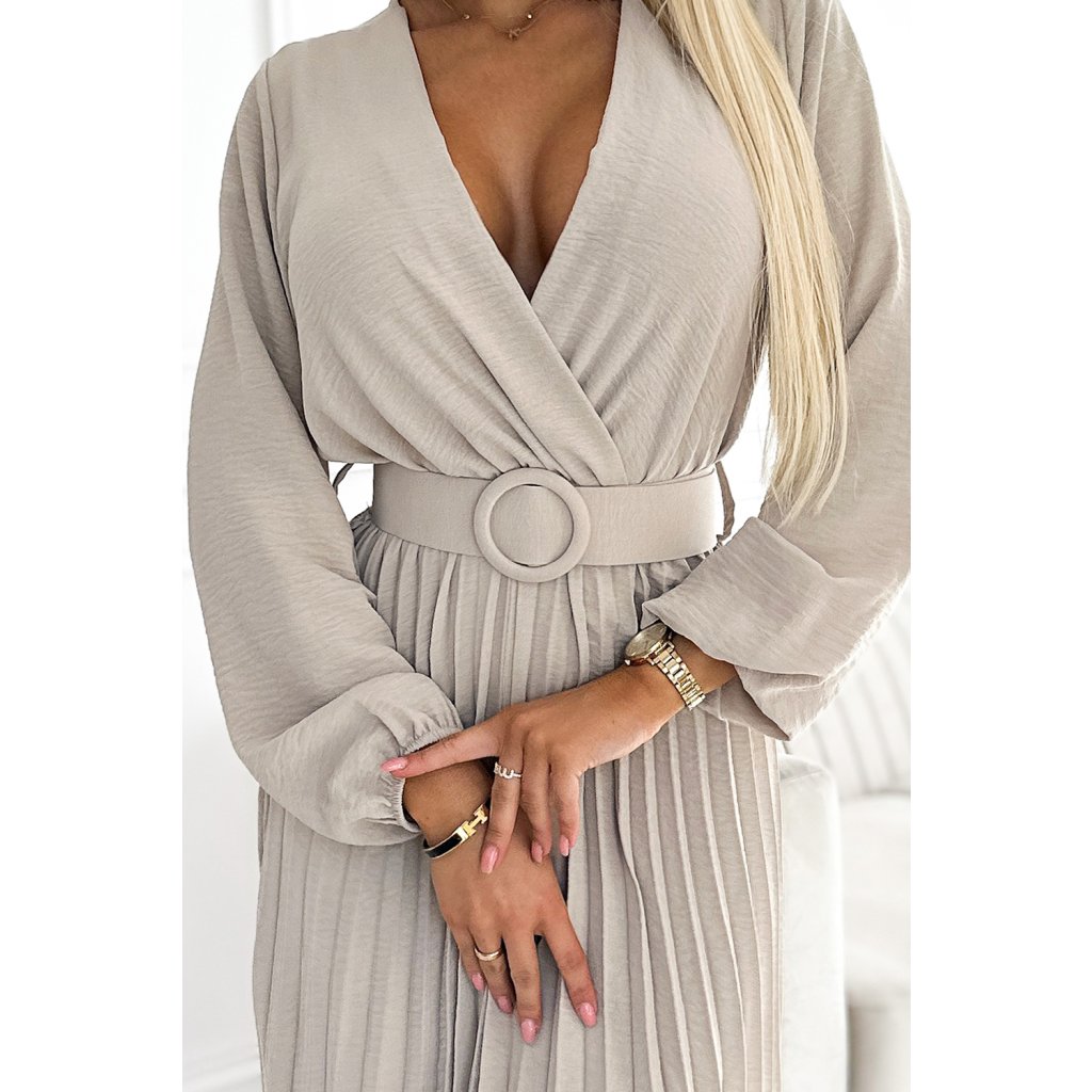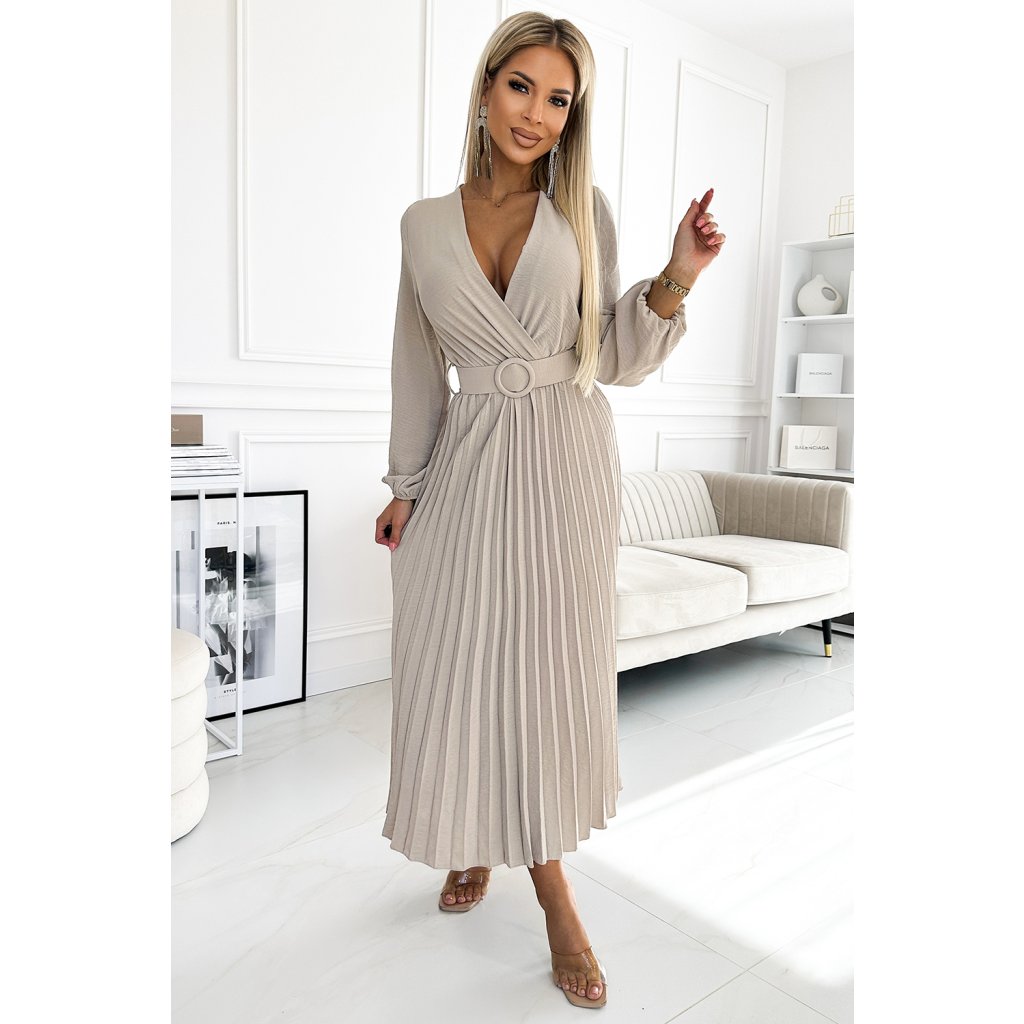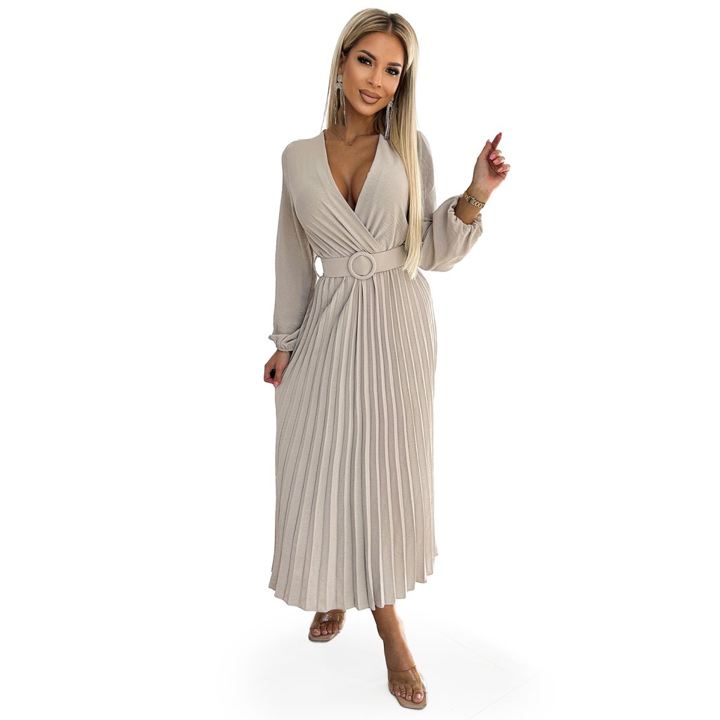 VIVIANA Plisované midi šaty s výstřihem, dlouhým rukávem a širokým páskem - béžová barva 504-2