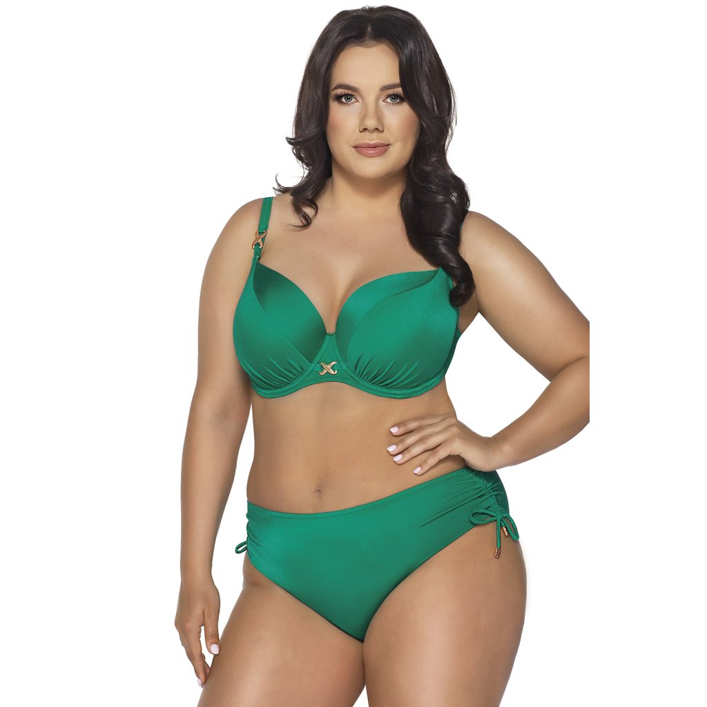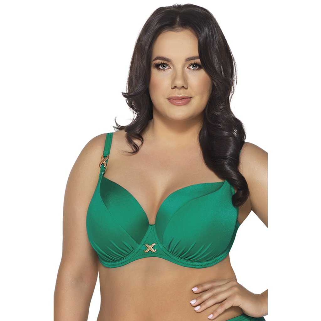 Dámské jednobarevné plavky Ava horní díl. Podprsenka má vyztužené hluboké košíčky, ve spodní části jsou nařaseny. Mezi košíčky je ozdobná zlatá aplikace. Kostice v košíčcích zaručují, že plavky drží stálý tvar. Pevně všitá raminka jsou nastavitelná, v přední části mají zlatou ozdobnou aplikaci. Obvod je spíše pevnější a nelze regulovat. Zadní zapínání je ukončeno sponou ve tvaru mušle na záháknutí.Materiálové složení: 80% polyamid, 20% elastan