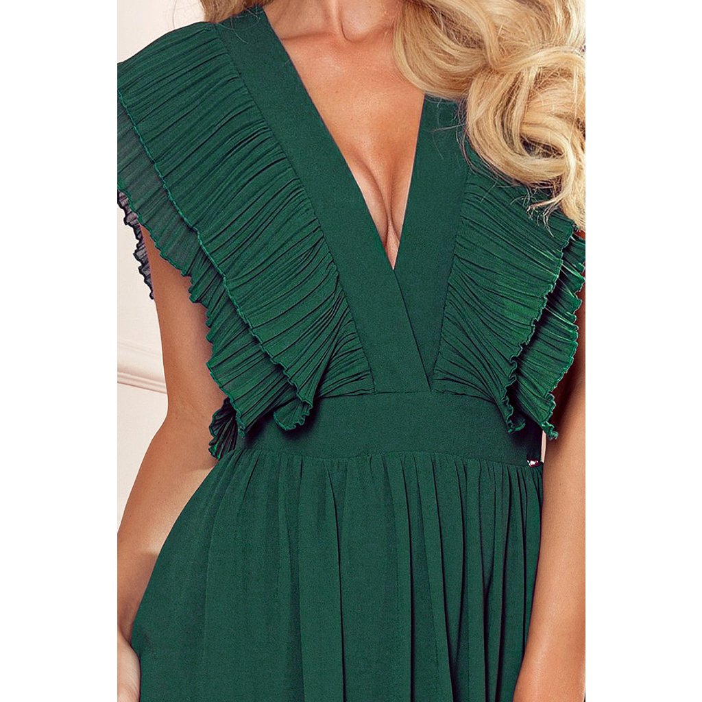 Yana - šifonové midi šaty s výstřihem a řaseným řasením. Sukně je vyrobena v módní 7/8 délce. Zapínání vzadu na krytý zip. Barva: zelená. Značka Numoco. Polská výroba.
