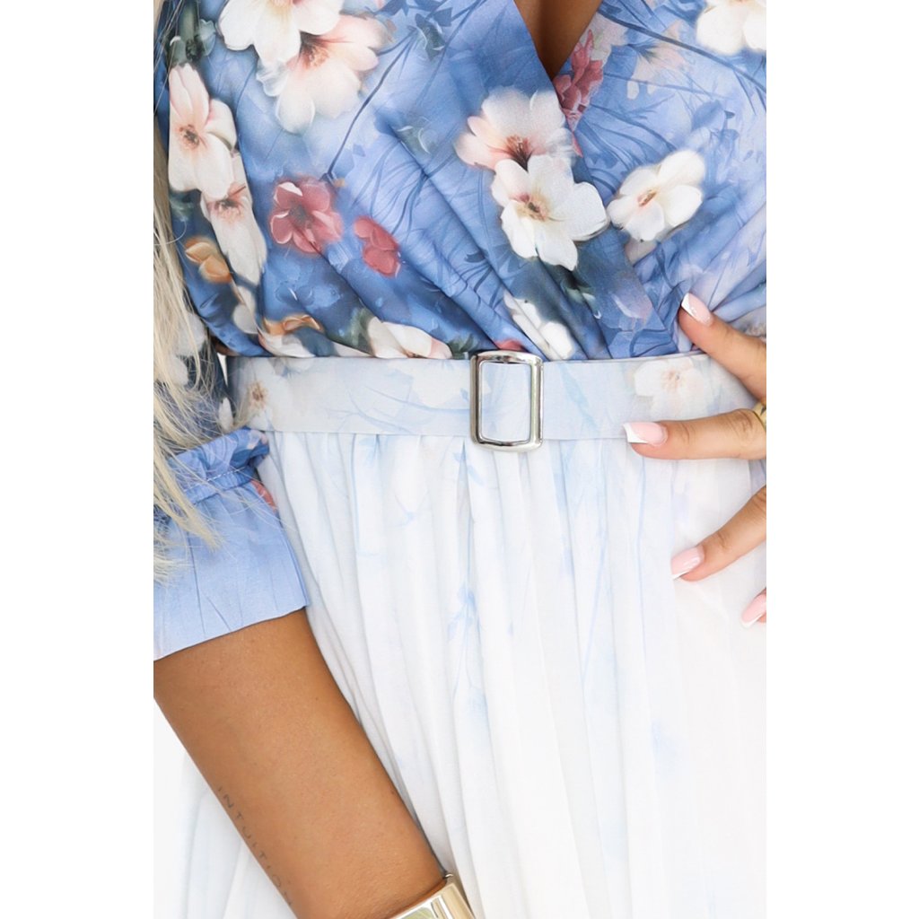 Ženské vzdušné midi šaty s výstřihem do V a sklady – světle modré s divokými květinami 605-1